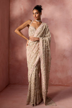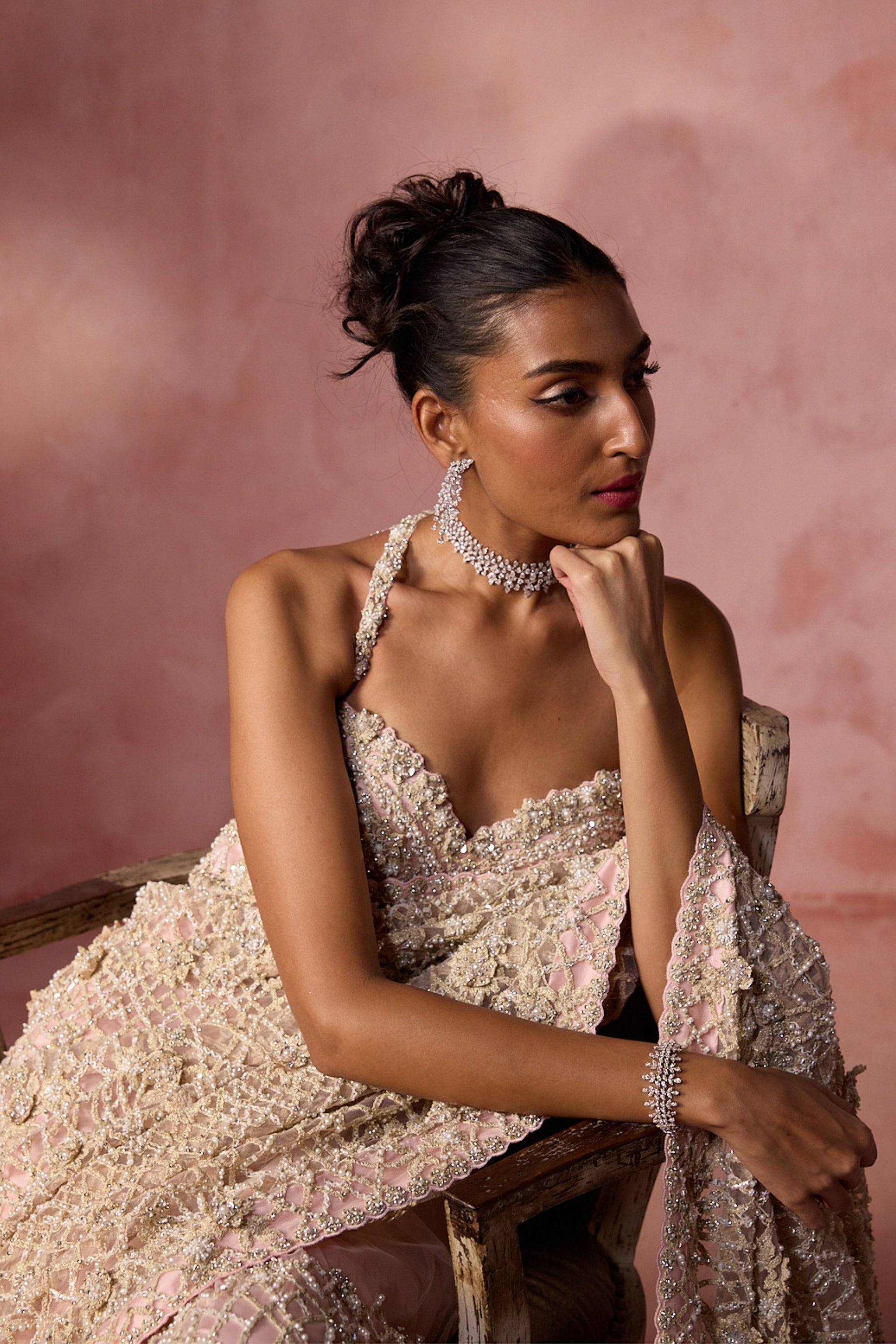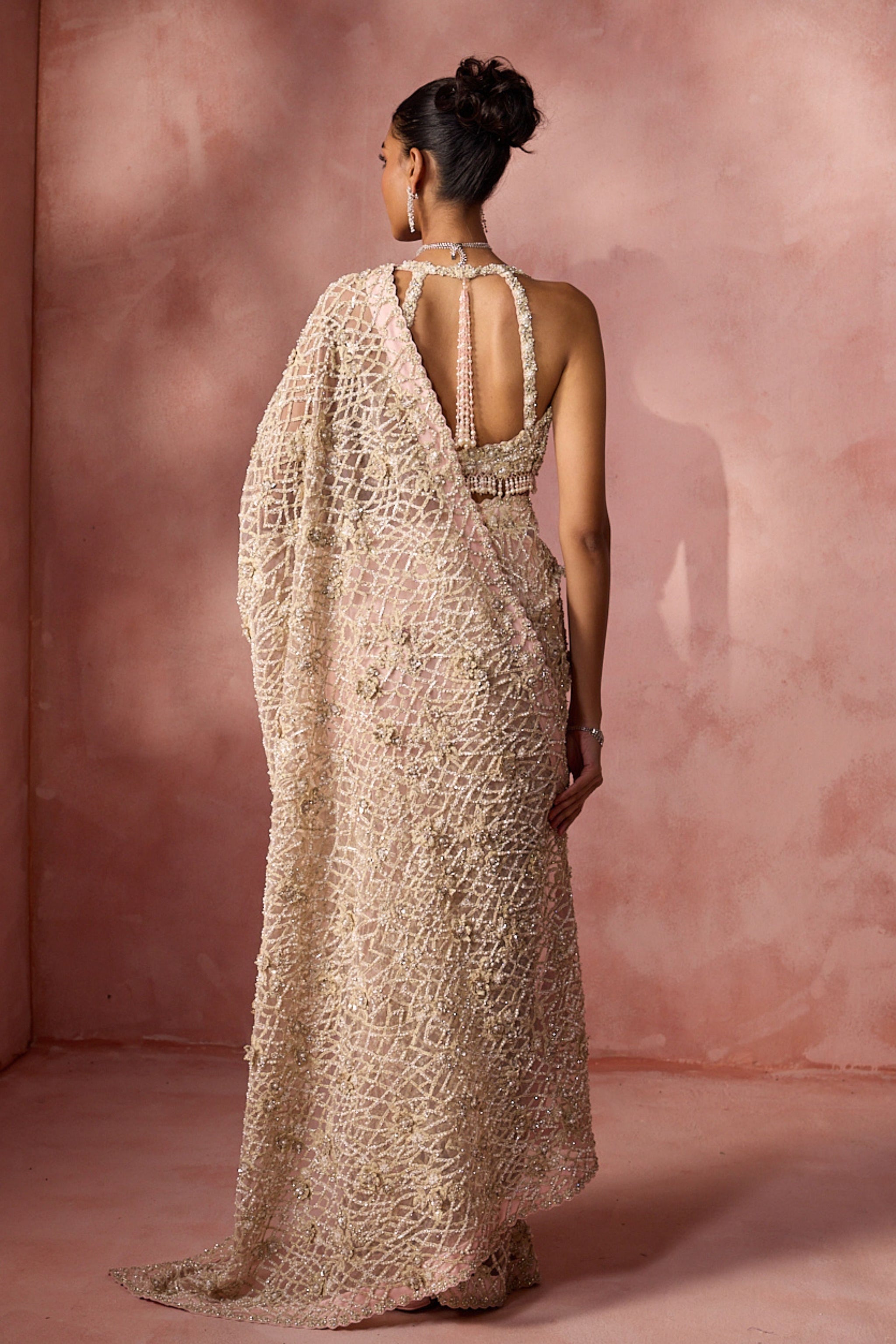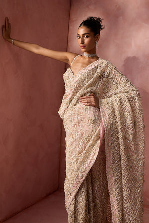 • Blush pink net saree blouse embroidered in an intricate all over jaal of tonal beads, sequins and crystals