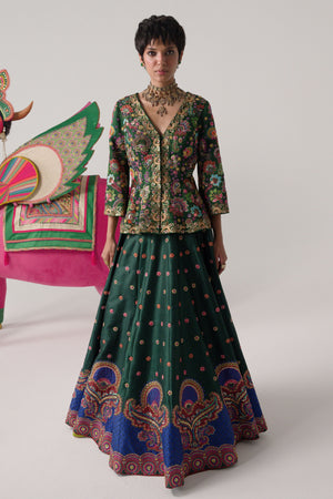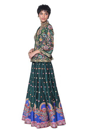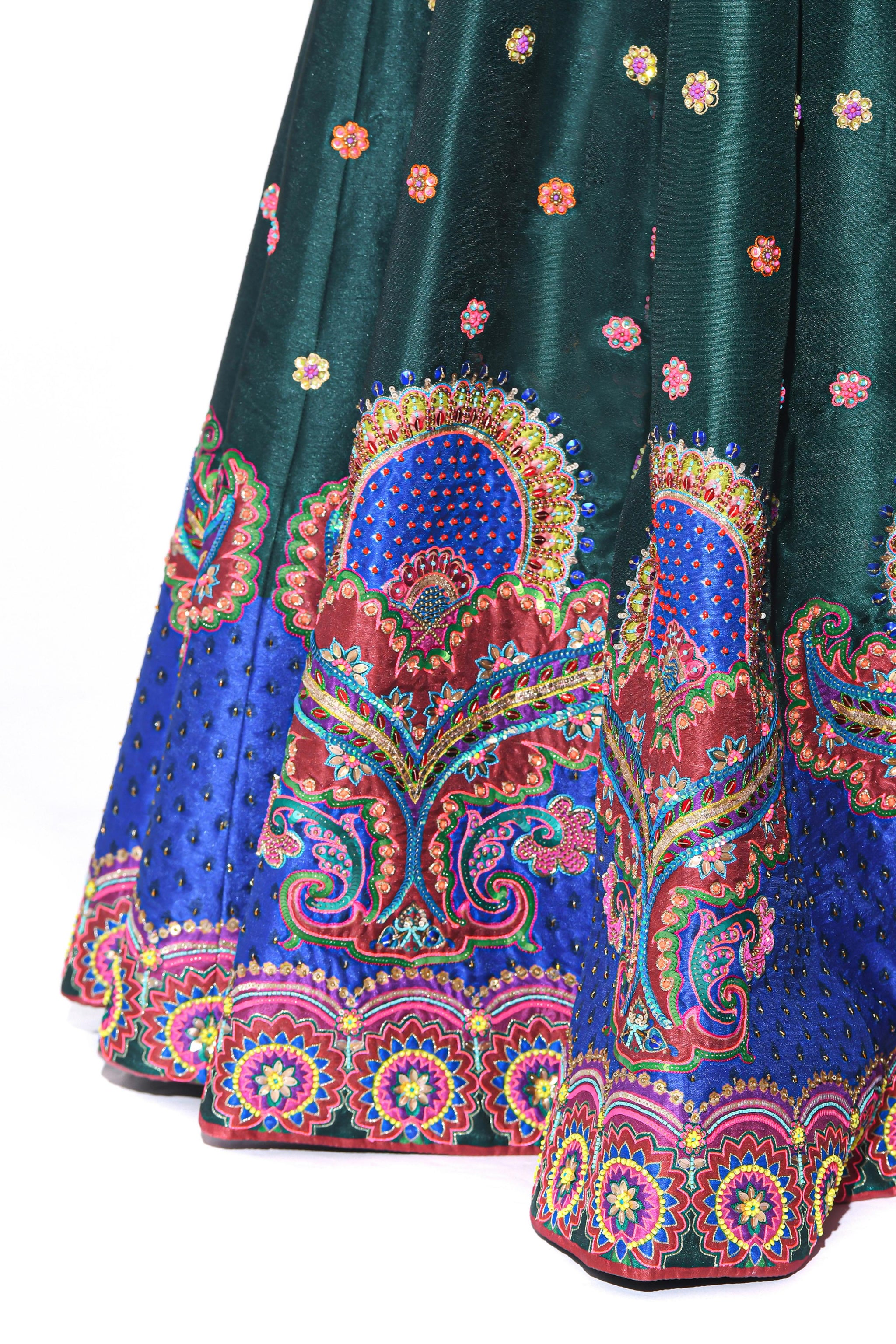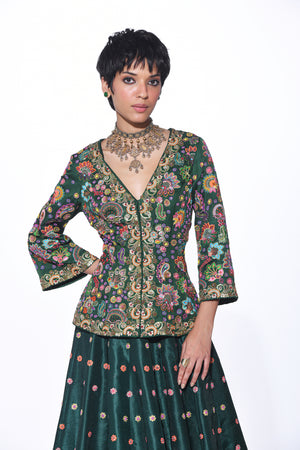• Bottle green heavy hand embroidery peplum top paired with bottle green hand embroidered lehenga.