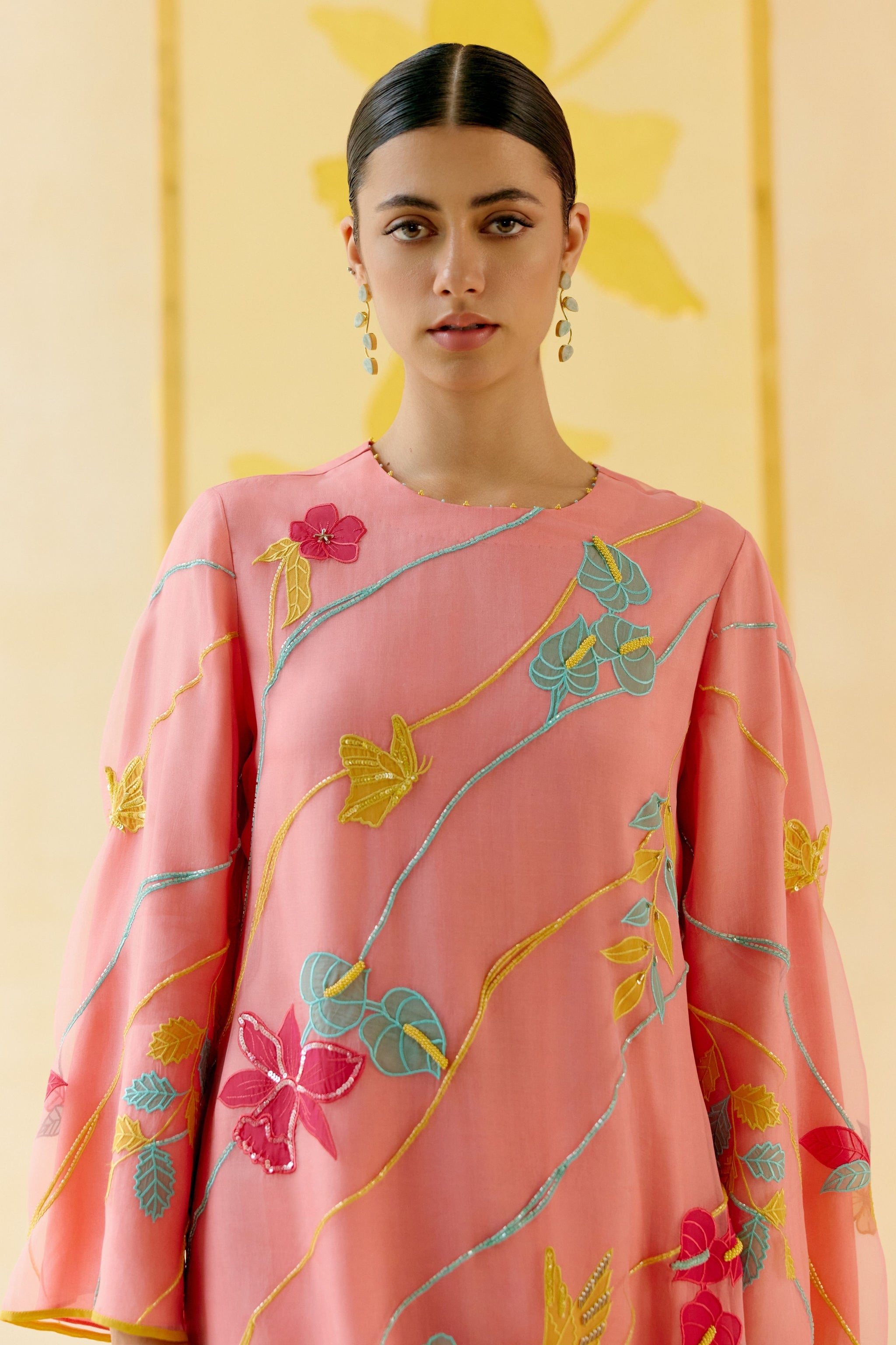 • The bougainvillea blush pink silk organza leher kurta set is delicately crafted with sheer appliqué work featuring flower petals and leaves. Inspired by the graceful sway of bougainvillea blooms in the breeze, the appliquéd petals on the leher kurta dance effortlessly amidst waves of hand-embroidered cutdana and sequins, shimmering like morning dew. Paired with half-elasticated pants, the ensemble offers uncompromised comfort and soulful style. The ensemble is crafted to enchant and inspire, echoing the timeless elegance that blossoms with every spring.