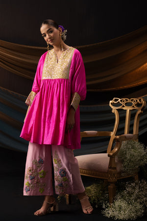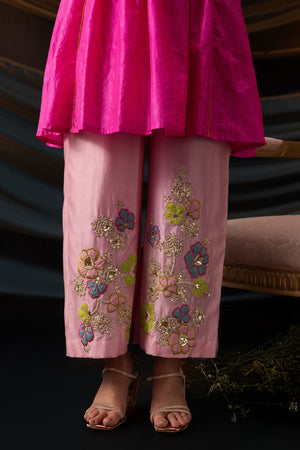 • Bright pink silk tunic with yoke detail embroidered with 3d floral motifs decorated with dori, resham, pearls and sequence. It is paired with embroidered chanderi pants with applique work decorated with resham, pearls and sequence.
