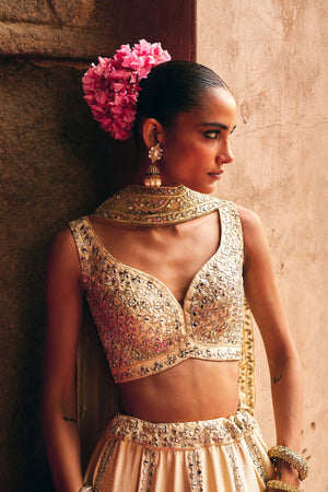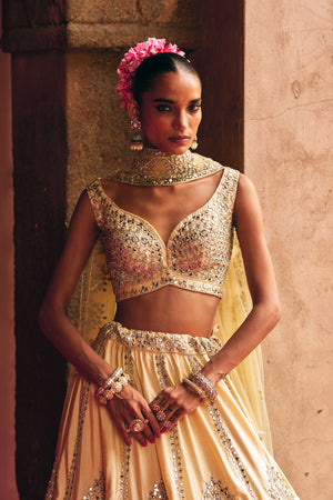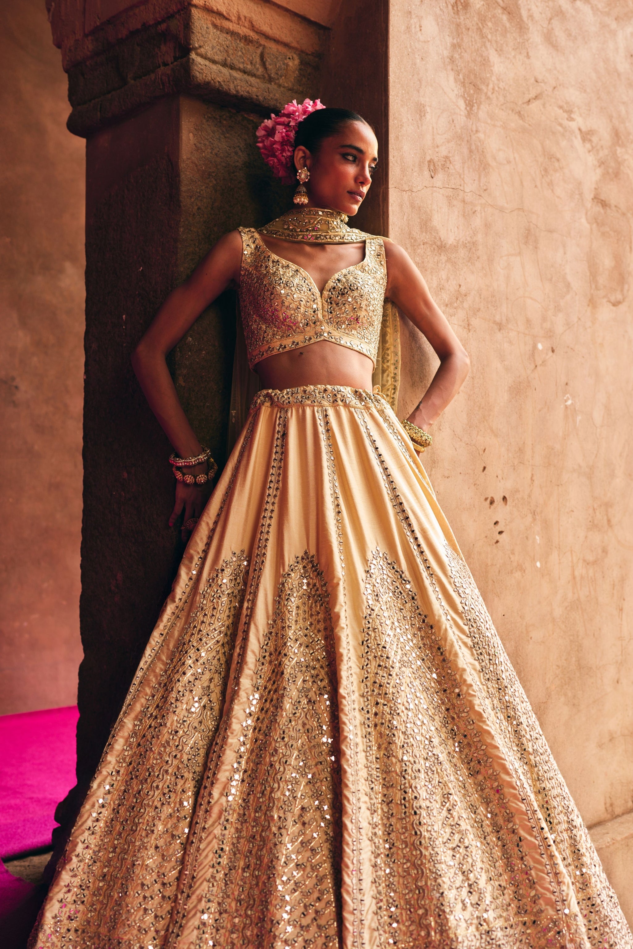 • A champagne gold lehenga encrusted with dense mirror work, highlighted with zari and gota embroidery, creating a luminous shimmer from every angle