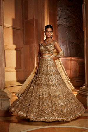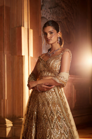 • Champagne gold tulle lehenga choli dupatta with worked belt embroidered with gold beads, crystals and leather flowers