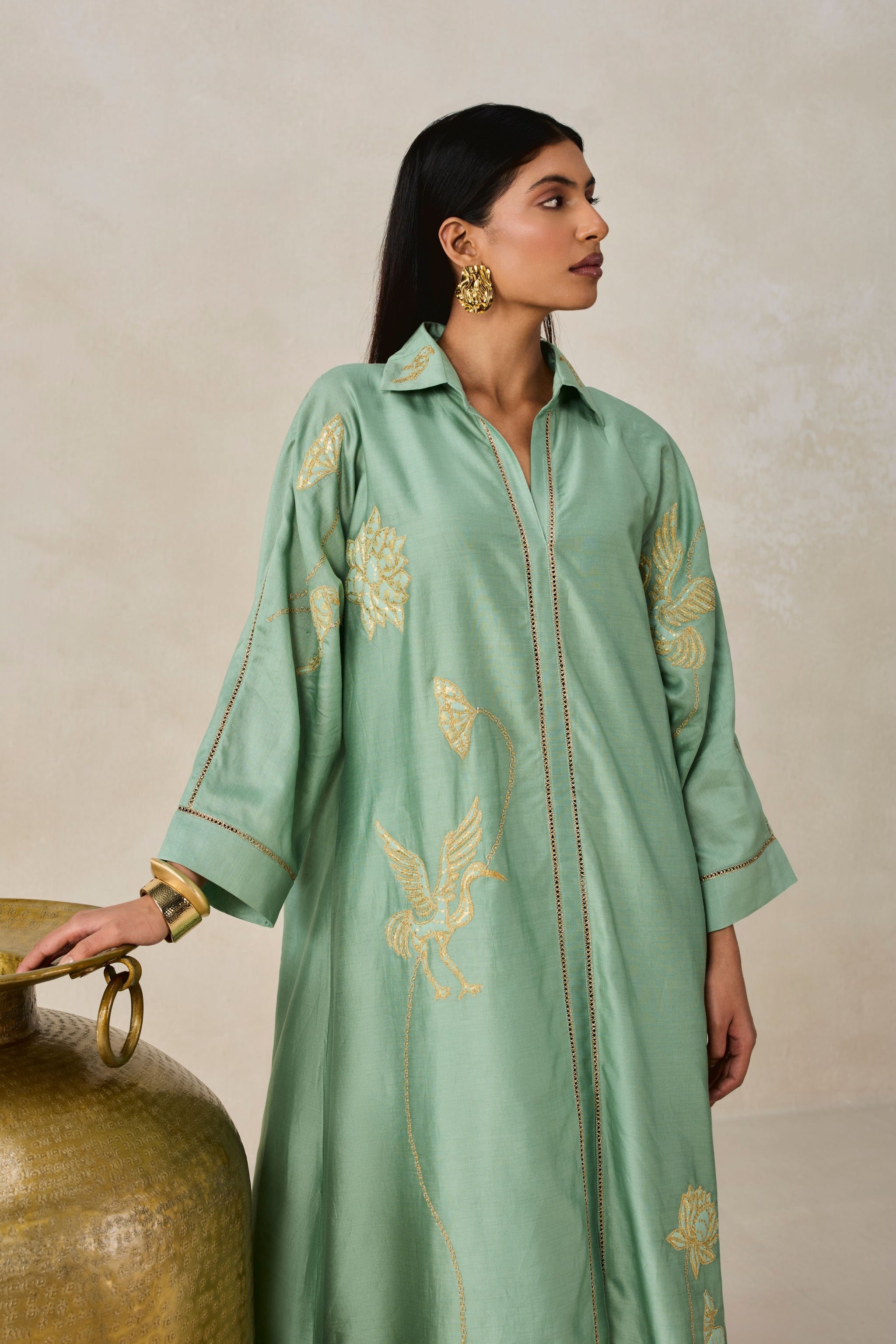 • This is a refined two-piece kurta and salwar set crafted in luxurious Chanderi fabric, presented in a soft sage green tone. The ensemble blends minimal tailoring with narrative, heritage-inspired embroidery, resulting in an elegant yet contemporary statement. The kurta features delicate applique work, placed with restraint and intention, Crane/bird motifs & Lotus floral motifs