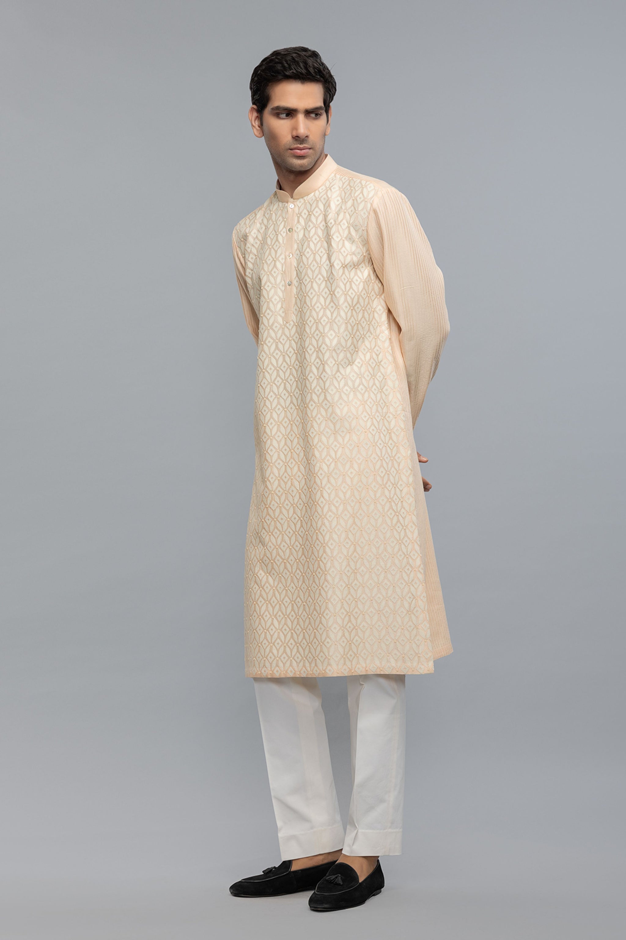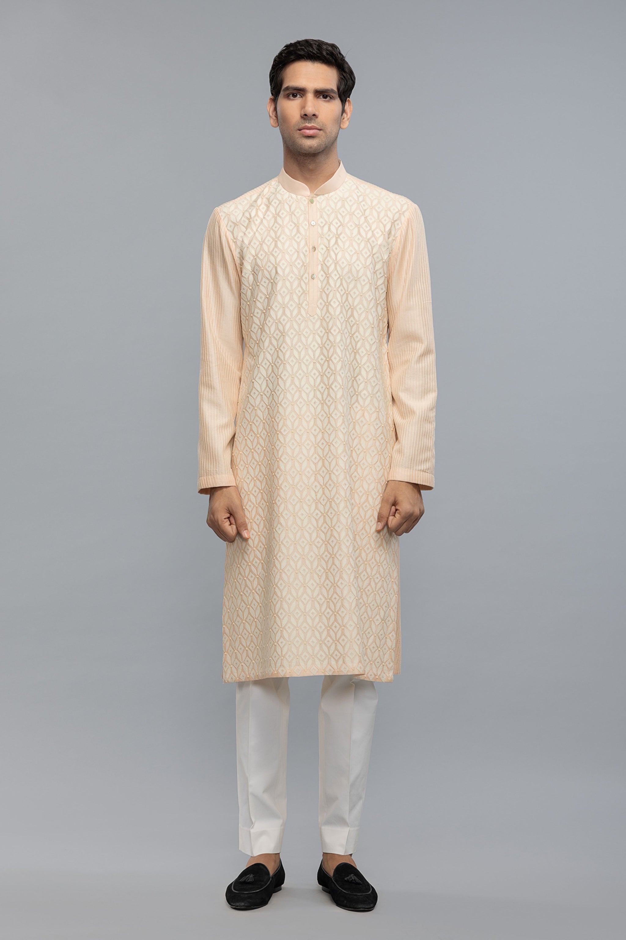 • Elevate your festive and occasion wear wardrobe with this refined men's kurta crafted in luxurious chanderi fabric. Featuring matka-style appliqué and delicate handcrafted threadwork, the kurta showcases a blend of traditional artistry and modern elegance. Paired with lightweight voile pants for a breezy, comfortable fit. A timeless piece that reflects fine craftsmanship and subtle sophistication.