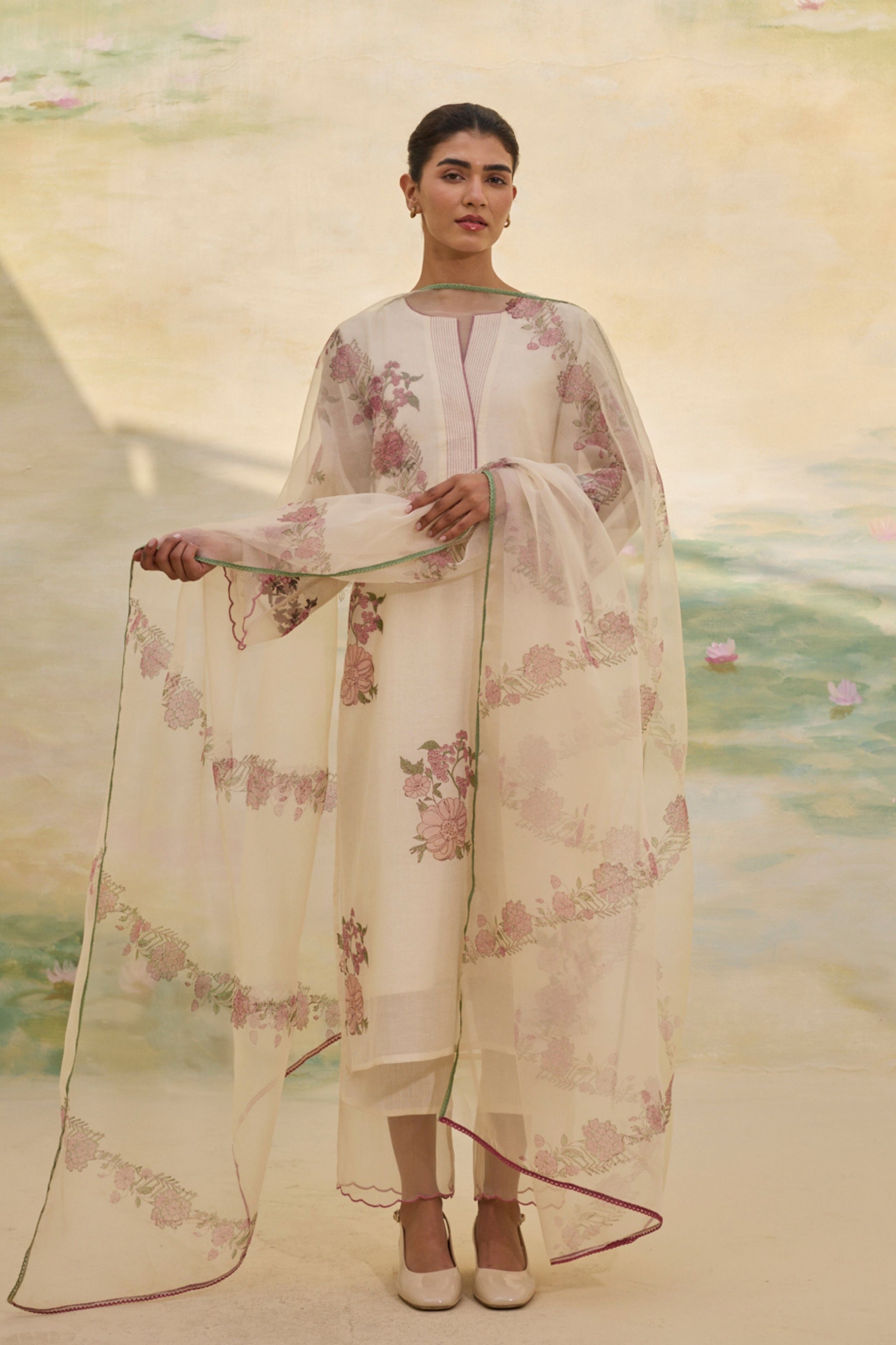 • Featuring a hand crafted relaxed fit chanderi set in a luminous ivory & rose,an exquisite celebration of artisanal elegance, this ensemble is crafted in premium chanderi and tailored in a relaxed silhouette for an effortless yet regal presence. The kurta is thoughtfully hand embellished with intricate resham and zari embroidery, highlighting the artistry and finesse of traditional craftsmanship. An exquisite celebration of artisanal elegance, it is paired with a sheer organza silk dupatta, beautifully bordered and adorned with delicate hand block print motifs along with lace on all four edges, creating a graceful frame of luxury. Completing the look are refined cotton trousers that balance comfort with sophistication, making the set a timeless wardrobe treasure. Variation in color, embroidery or print is part of handmade process.