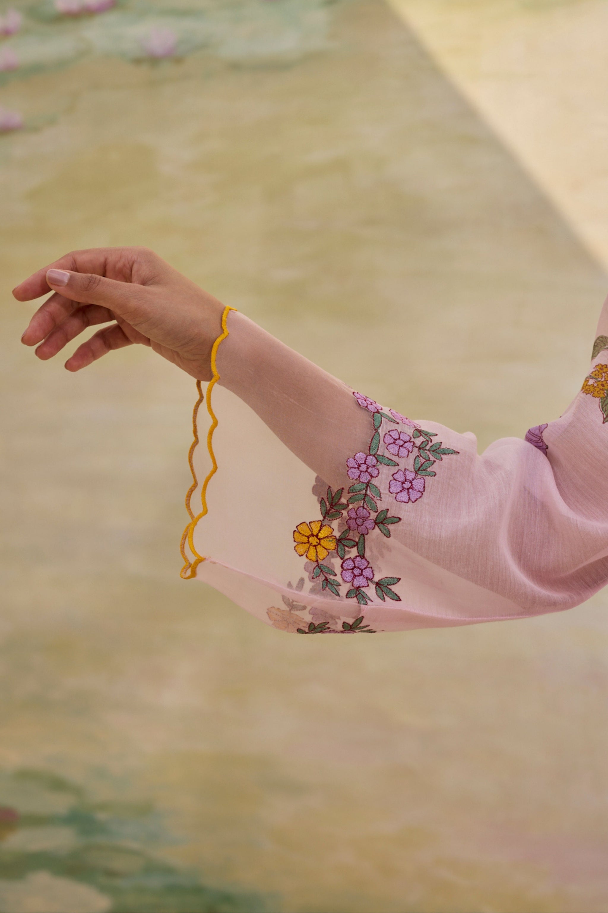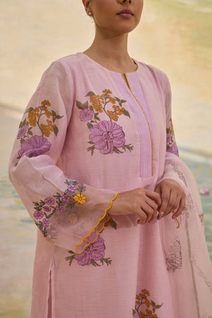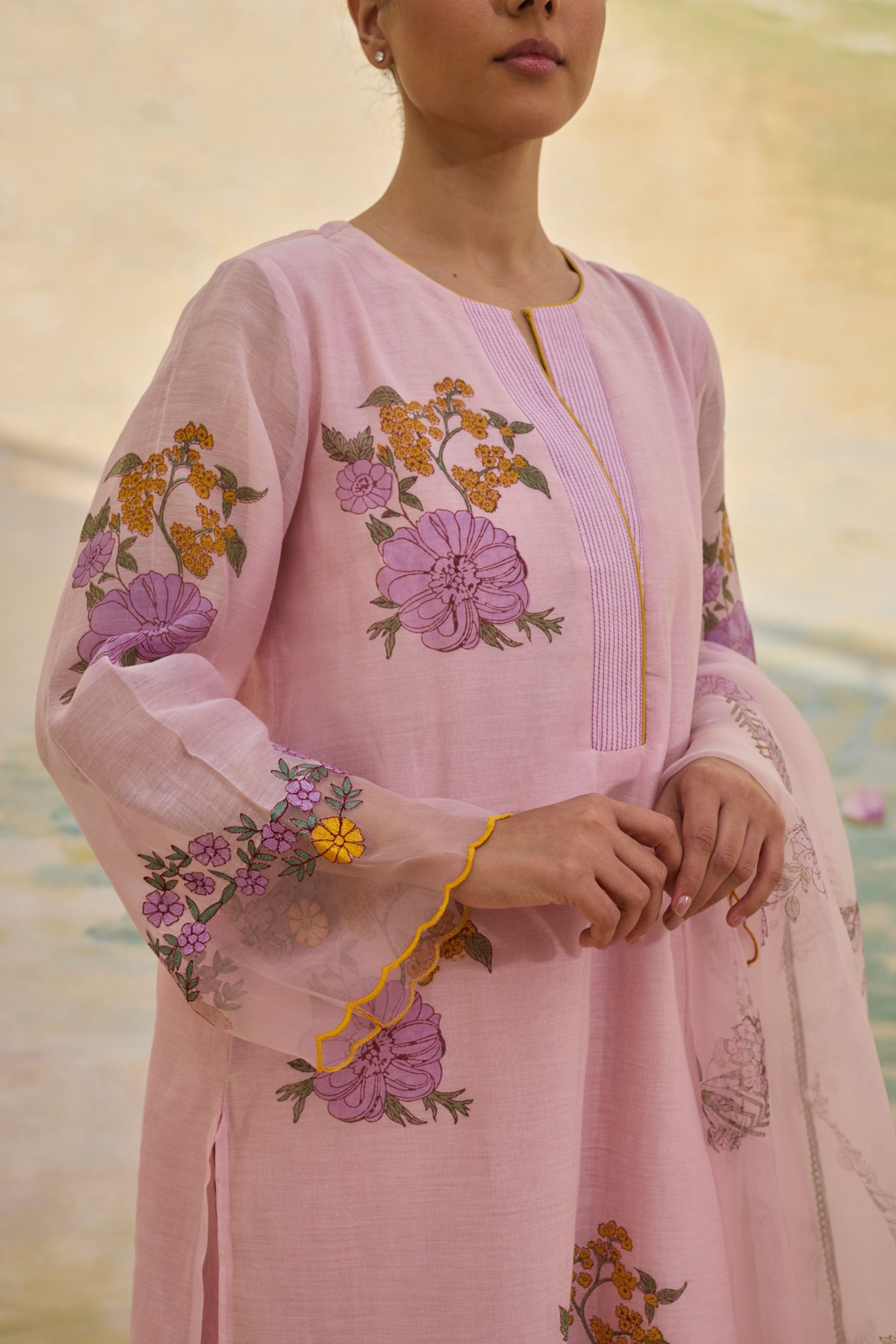 • Featuring a hand crafted relaxed fit chanderi set in a luminous lilac & violet, an exquisite celebration of artisanal elegance, this ensemble is crafted in premium chanderi and tailored in a relaxed silhouette for an effortless yet regal presence. The kurta is thoughtfully hand embellished with intricate resham and zari embroidery, highlighting the artistry and finesse of traditional craftsmanship. An exquisite celebration of artisanal elegance, it is paired with a sheer organza silk dupatta, beautifully bordered and adorned with delicate hand block print motifs along with lace on all four edges, creating a graceful frame of luxury. Completing the look are refined cotton trousers that balance comfort with sophistication, making the set a timeless wardrobe treasure. Variation in color, embroidery or print is part of handmade process.