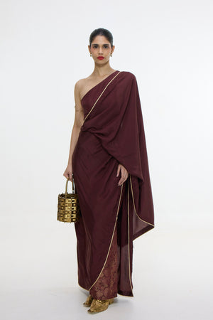 • For the first time ever, we introduce our version of a pre-draped saree- a seamless union of ease and elegance. The set features a handwoven silk petticoat that doubles as a skirt, paired with a fluid silk drape detailed delicately along the borders. Designed to move effortlessly between traditional and contemporary, this versatile ensemble transforms from saree to dress, embodying the fluid dialogue between cultures, crafts, and modern femininity. We recommend giving this timeless weave a modern twist. Pair it with crisp white shirt or a structured corset for a fun look. This one's perfect for cocktail celebrations, festive dinners, or a diwali party.