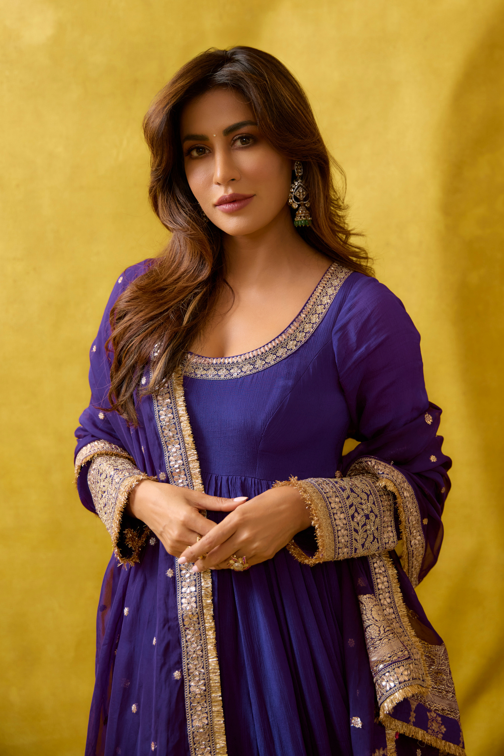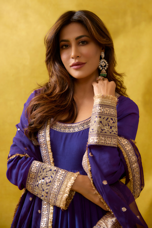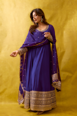 • This exquisite Anarkali suit, designed with flared silhouette that exudes elegance and charm. The bodice and hemline are highlighted with intricate embroidery and embellished borders. The long sheer sleeves and coordinating dupatta, adorned with delicate motifs and a richly embroidered border, complete the look with sophistication.
