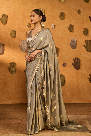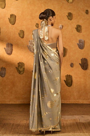 • Crafted in raw silk, this claymelt grey saree features a refined gold and silver ombré foil print in a half-and-half layout. It is paired with a tissue halter-neck blouse, creating a sleek and contemporary festive look.