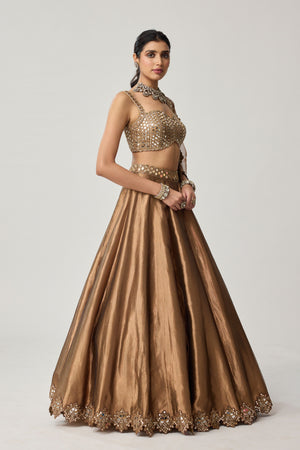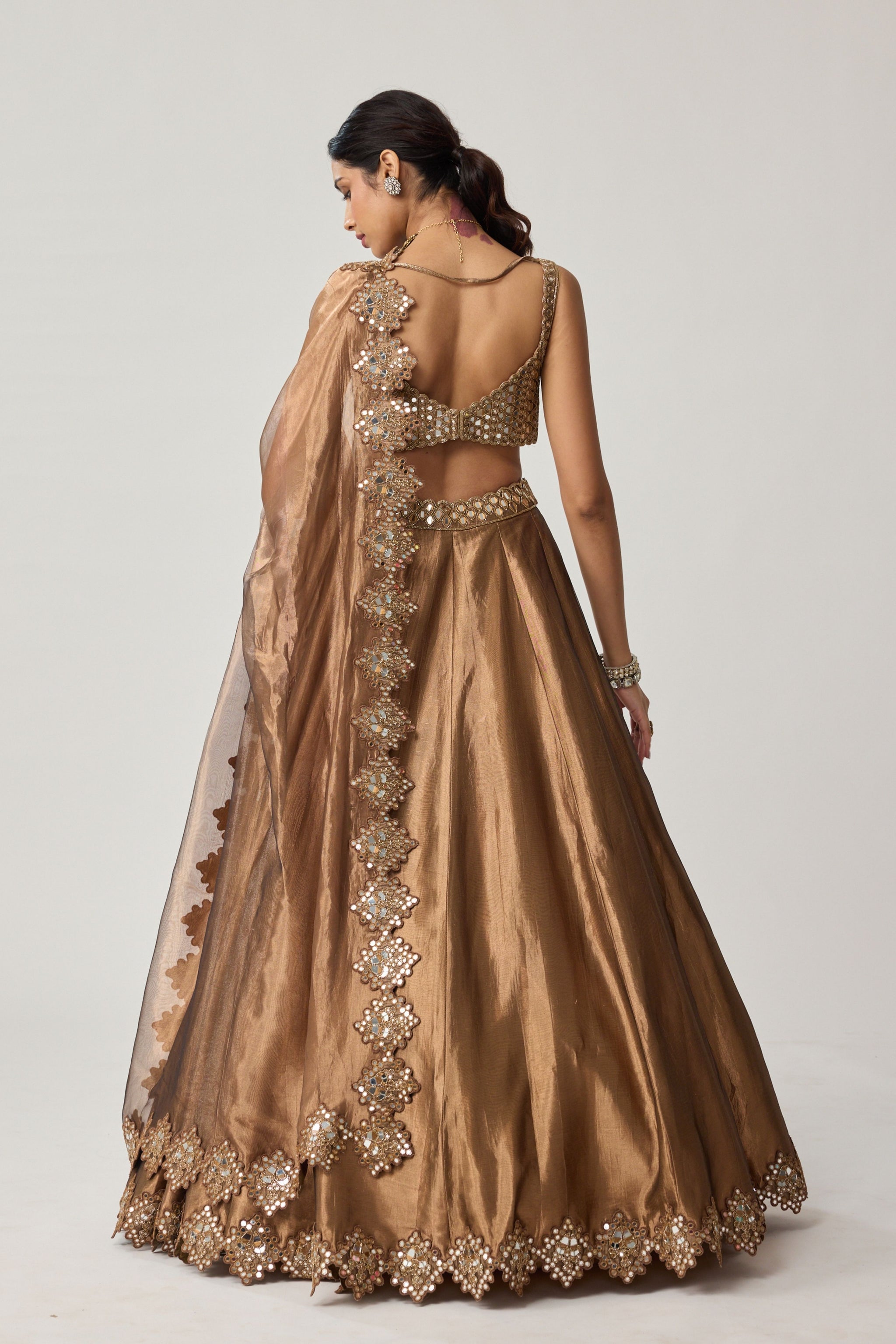 • Copper shimmer organza lehenga and dupatta clubbled with real hand cut mirror embroidered blouse.