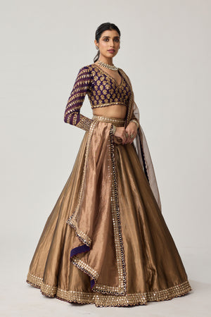 • Copper shimmer organza lehenga and dupatta clubbled with mughal motif embroidered blouse.