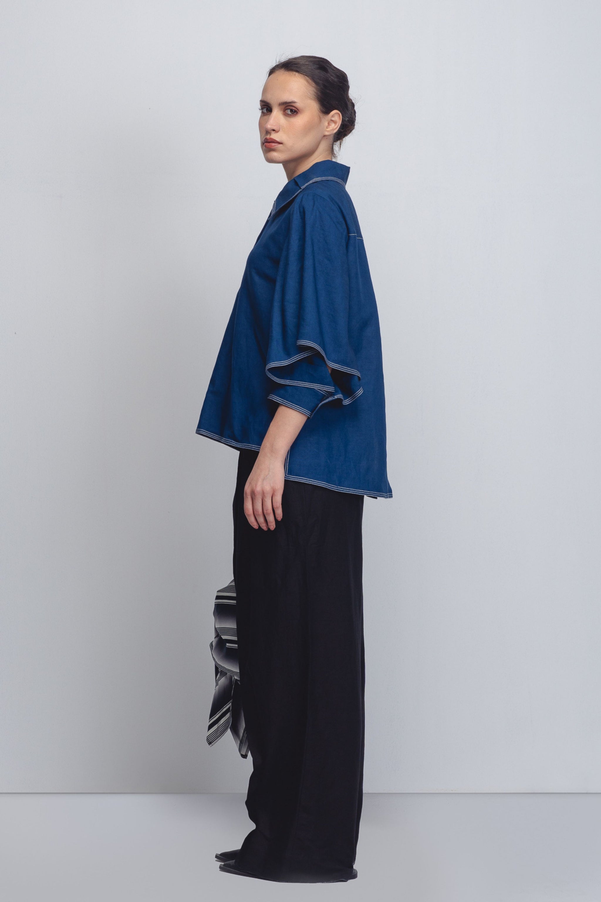 • Cut and tailored in 100% linen, Designed with a high-waisted fit, these pants feature deep vertical pleats that run the full length of the leg, creating a sharp, structural fold. top 25". The model is 5'8, and the garment length is 43 inches.