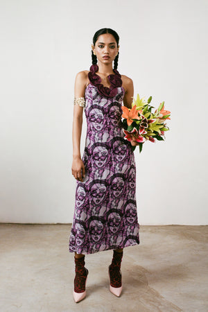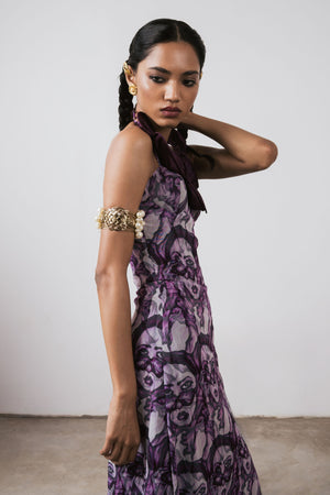 • Crafted in silk georgette, the cosmic shift dress features a graceful fit-and-flare silhouette with a tie-up neckline, structured cups on the bodice, and a flowing slit. The neckline is highlighted with a unique cosmic swirl fabric manipulation, while the digital print across the dress adds a striking celestial charm.