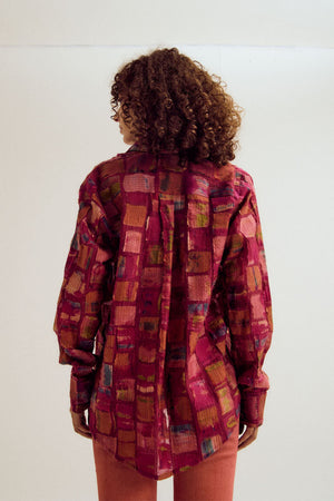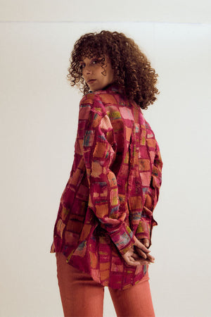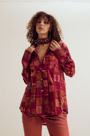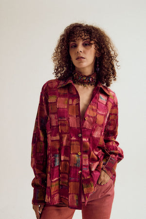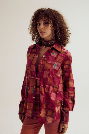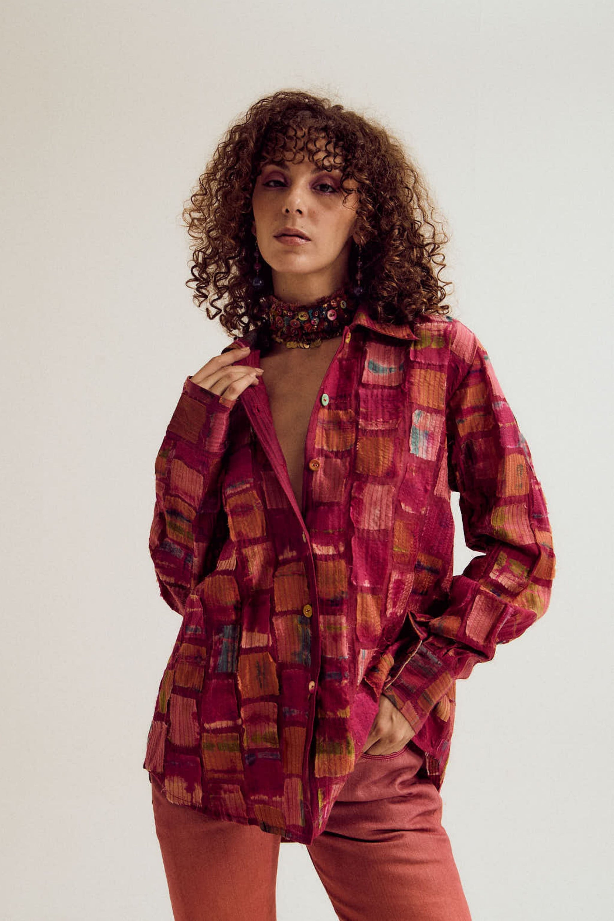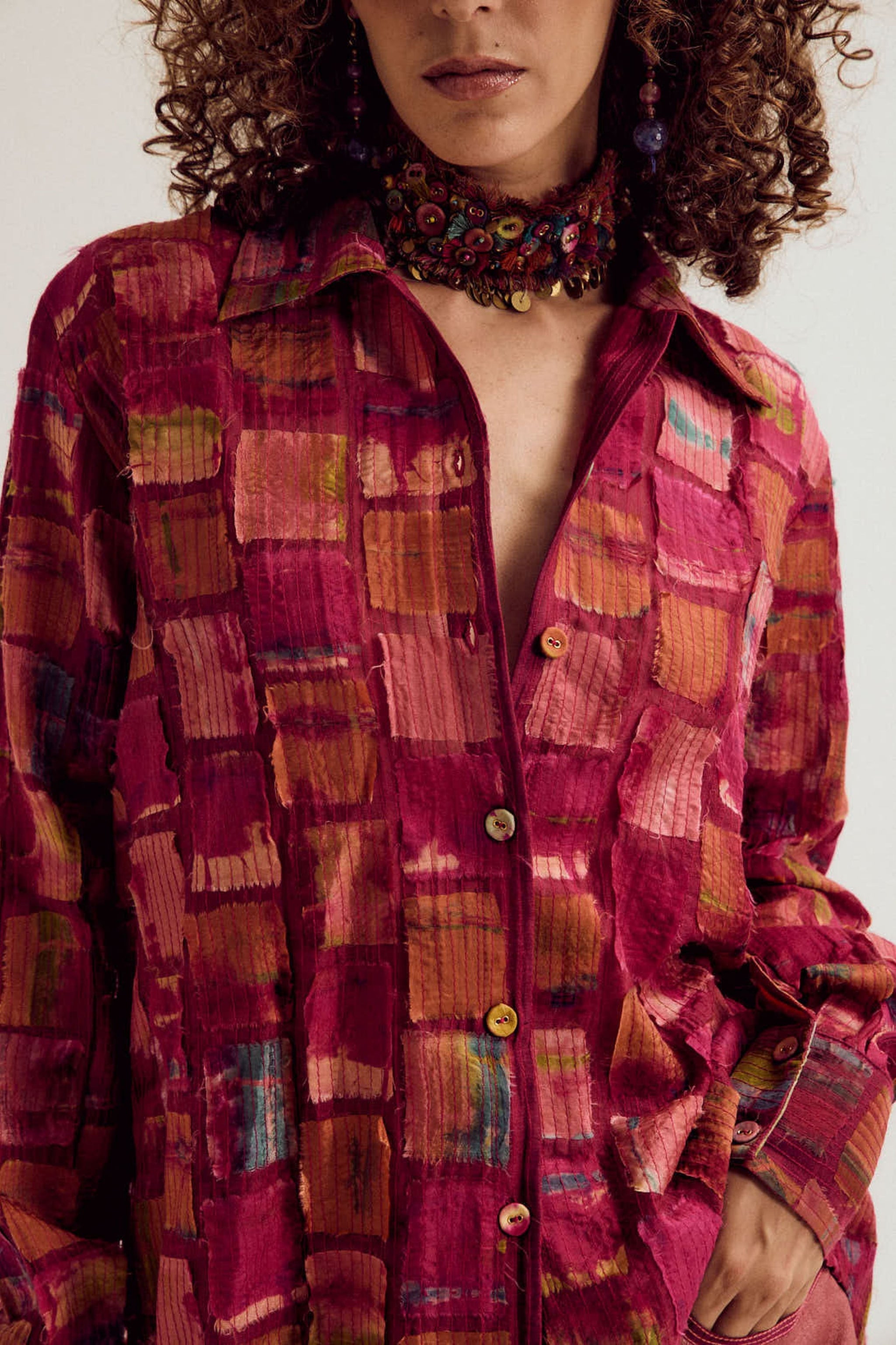 • A vibrant front-open shirt in bold fuchsia, showcasing artisanal patchwork accented with intricate thread embroidery. A versatile piece that adds a handcrafted touch to both casual and elevated looks.