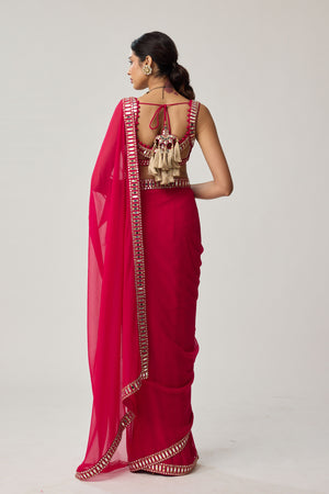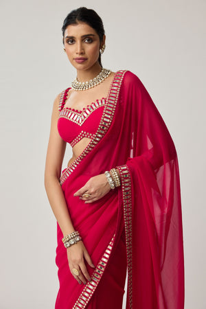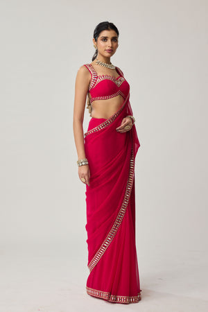 • Crimson red mirror embroidered georgette saree clubbed with real hand cut mirror embroidered sleeveless blouse.