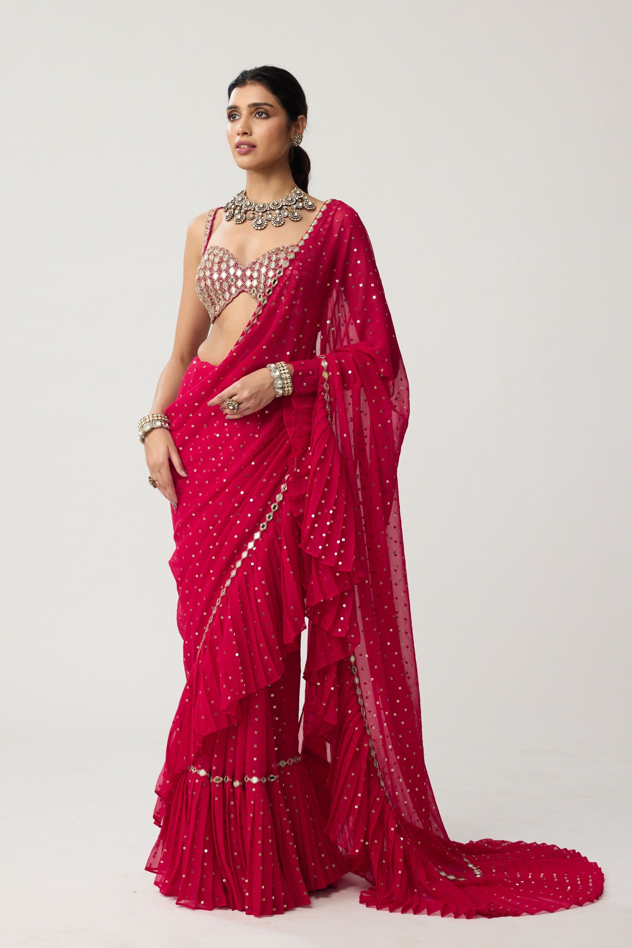 • Crimson red mirror embroidered georgette saree clubbed with real hand cut mirror embroidered sleeveless blouse.