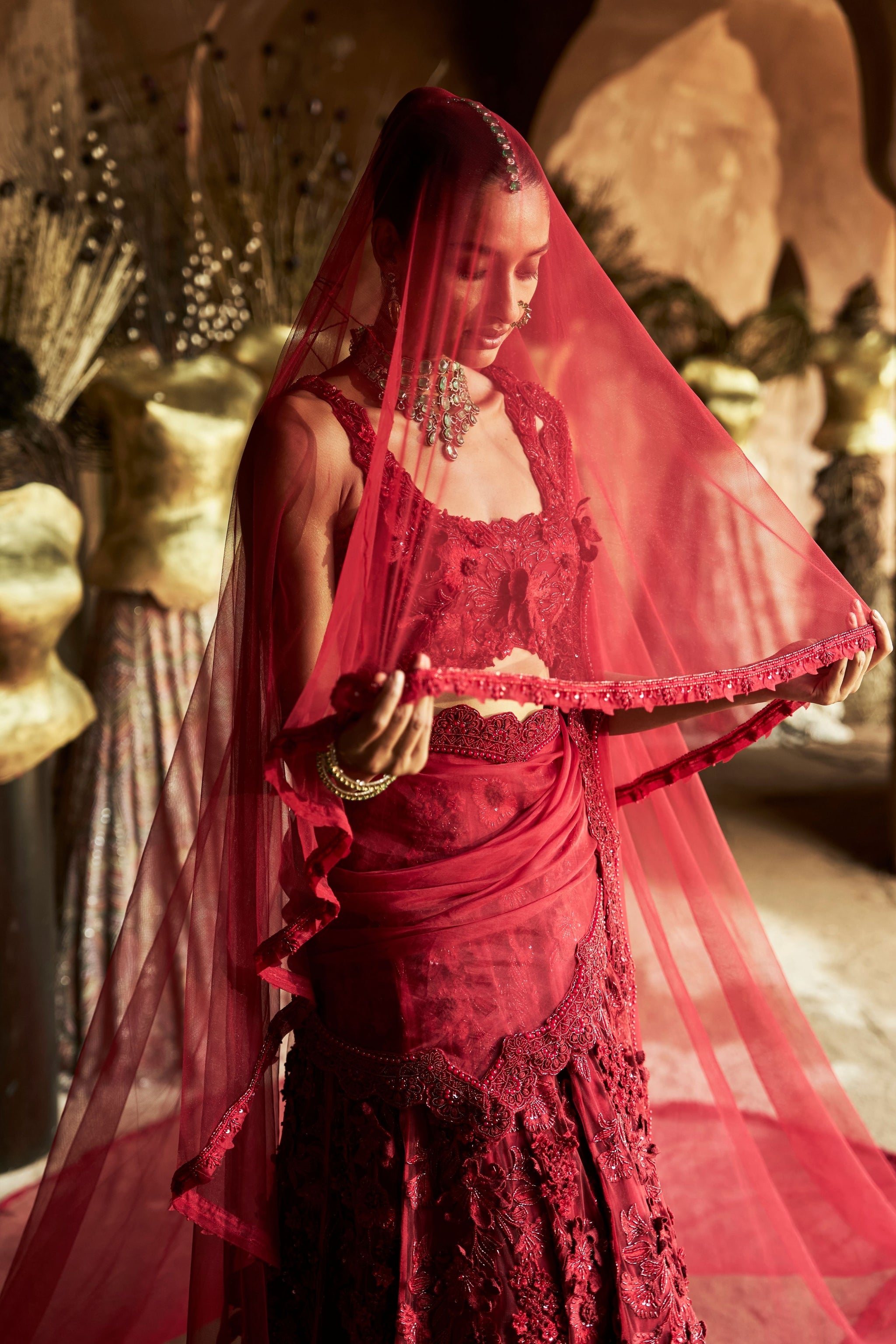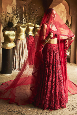 • The Crimson Rose Lehenga Set radiates bold elegance with layers of rich 3D floral embroidery. The voluminous lehenga features 3D motifs and textured layers that catch the light with every movement. Paired with a matching blouse showcasing ornate detailing and a flattering neckline, the look is completed with an organza scallop-embroidered dupatta that gracefully drapes over the shoulders—creating a dreamy, regal silhouette. Perfect for bridal or couture moments, this ensemble blends timeless elegance with modern opulence.