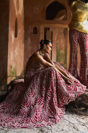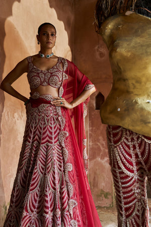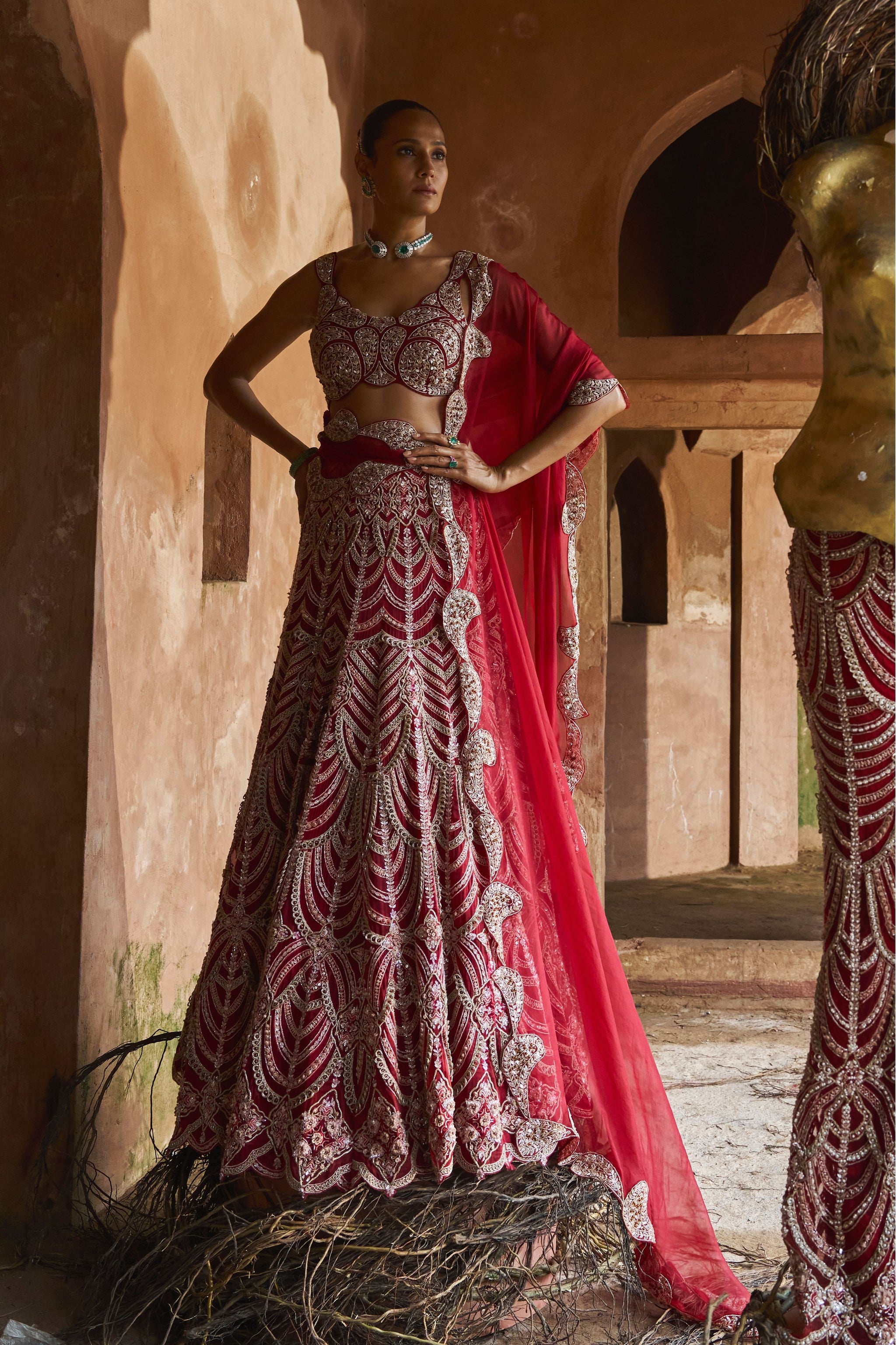 • The Crimson Royale Lehenga Set is a masterpiece of architectural embroidery and regal allure. The sculpted blouse showcases intricate thread work and bead embellishments, while the voluminous lehenga features layered scallop patterns in tonal reds and golds, creating depth and movement with every step. Paired with a pure organza dupatta edged in ornate embroidery, this ensemble blends traditional bridal opulence with a strikingly modern silhouette.