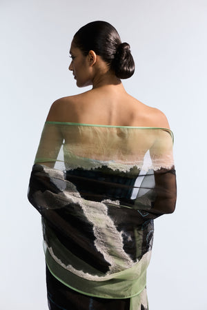 • A masterpiece of contemporary artistry, this organza saree mesmerizes with its translucence and bold, abstract dye patterns. The interplay of deep black, serene green, and delicate silver accents creates a striking visual contrast, evoking a sense of fluid movement and natural textures. Crafted from lightweight organza, the saree drapes effortlessly, offering a structured yet airy silhouette.