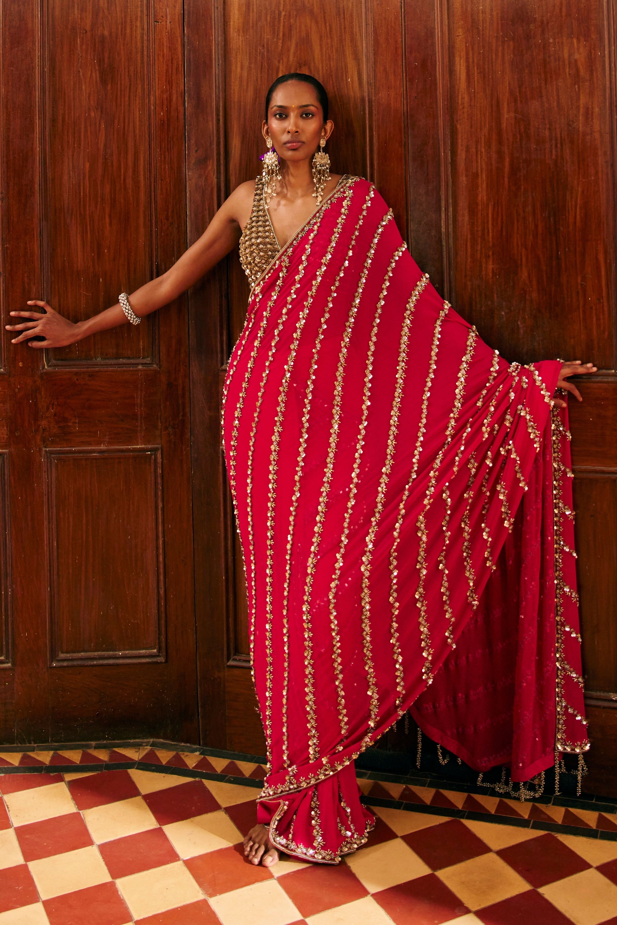 • This outfit features a dark pink saree with a matching blouse.