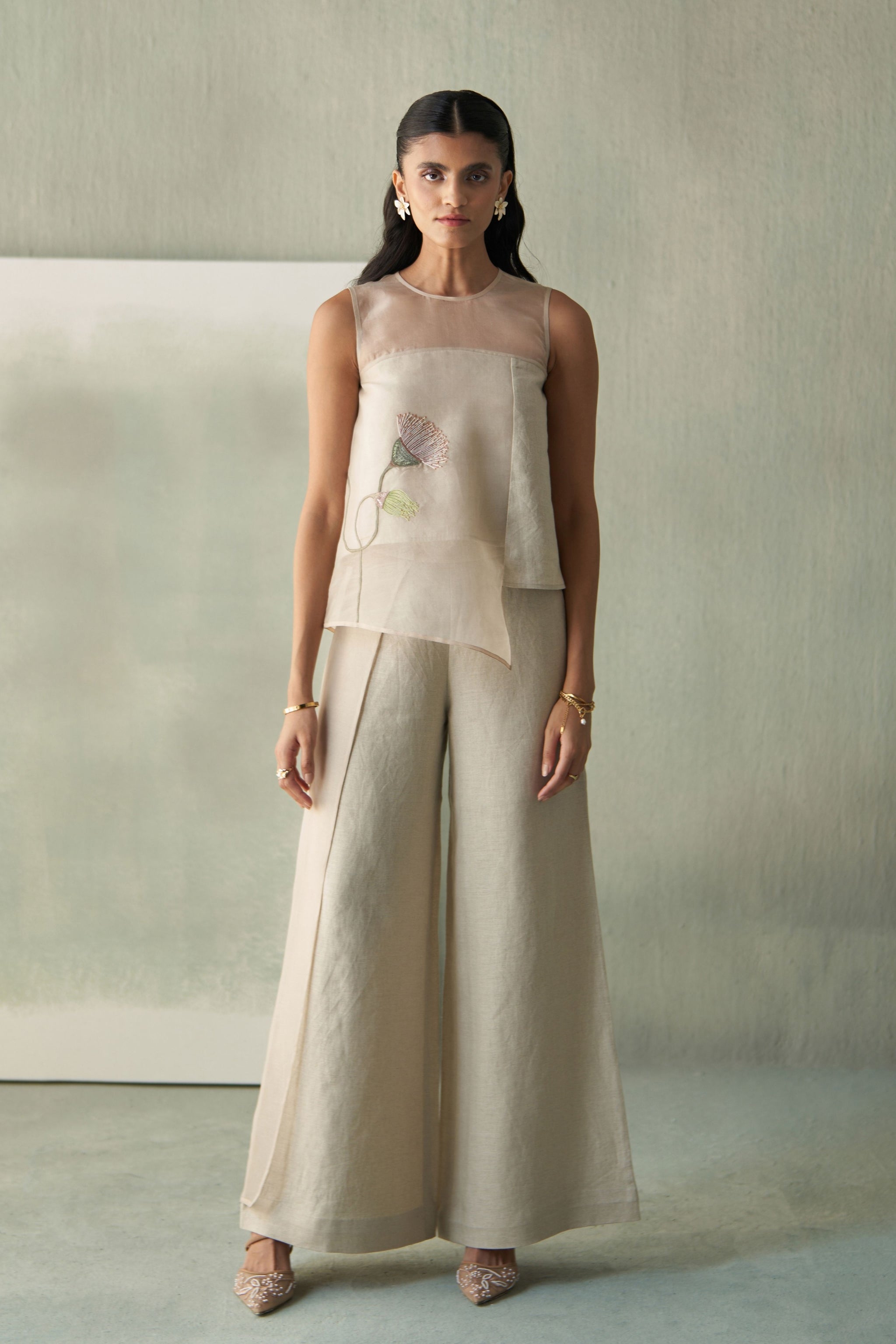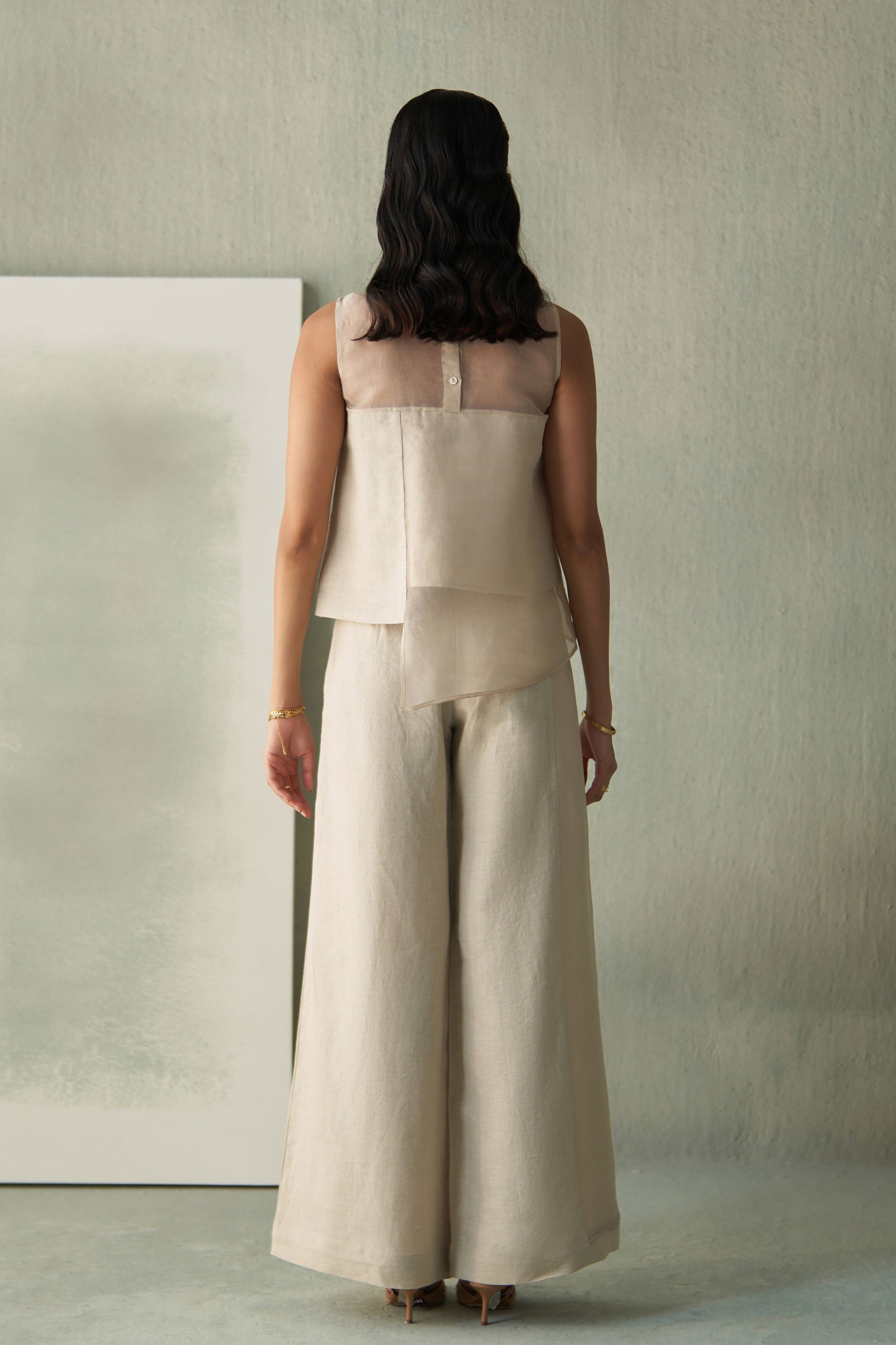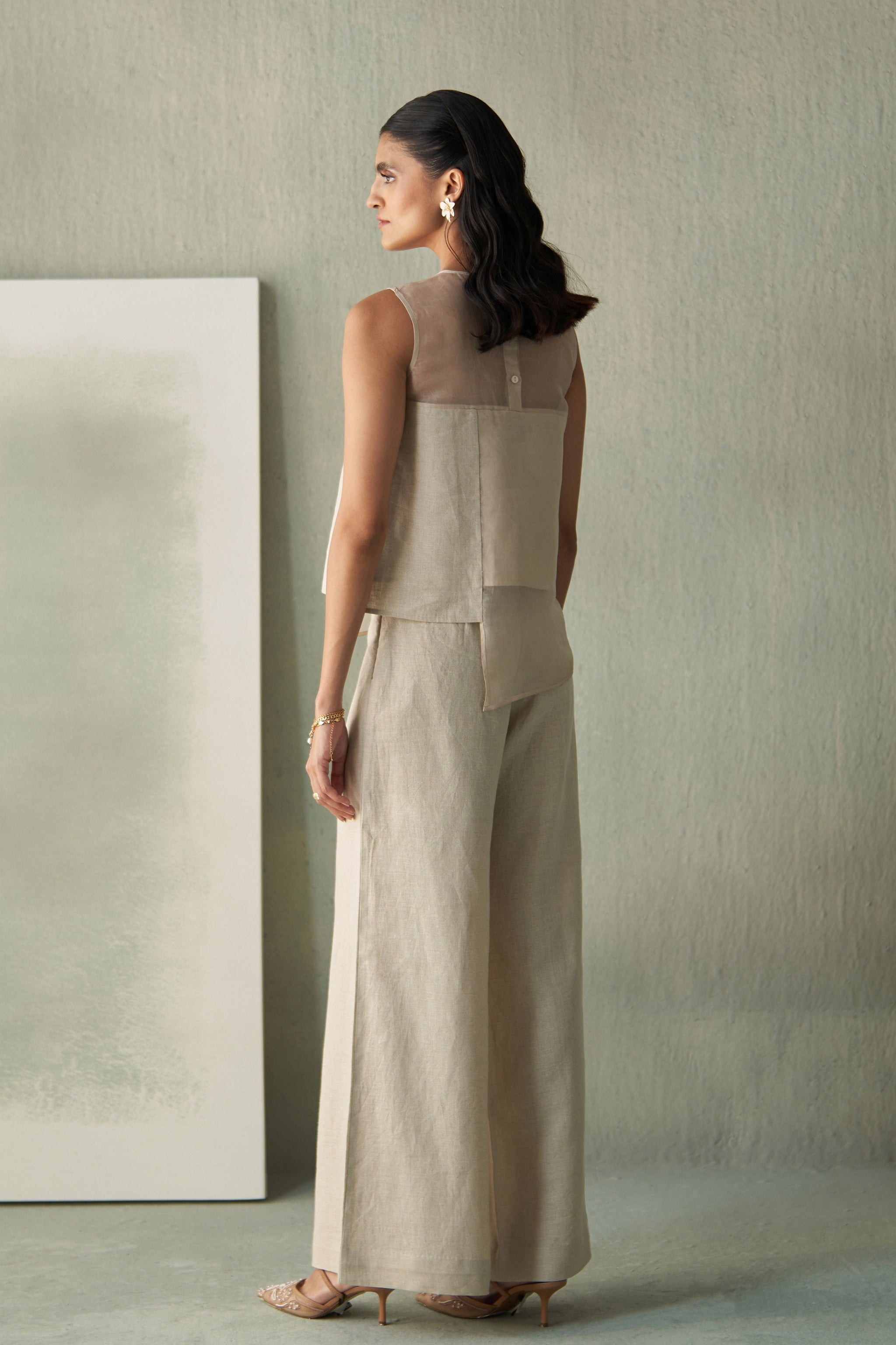 • Wide-leg linen trousers in a relaxed silhouette and clean tailoring. Designed in a soft sand hue, they're easy for movement and have a sheer panel to make a statement minimally. A timeless essential that pairs beautifully with the desert sand linen top for an effortlessly formal co-ord look.