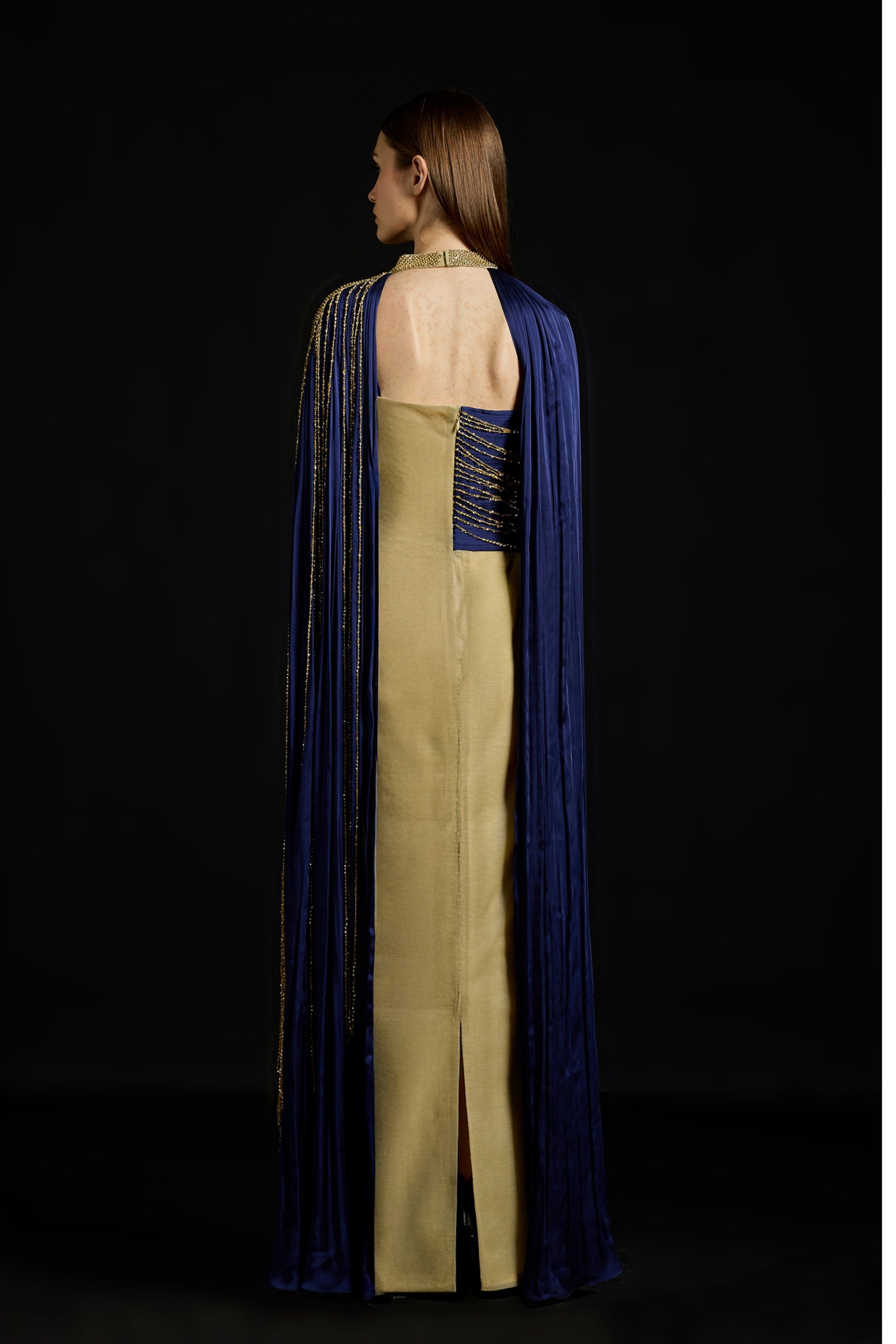 • Metallic-Tulle kaftan-dress with a hand-dyed and gathered Chiffon drape and fall-panelled sleeves. Hand-embroidered sequin fringes.