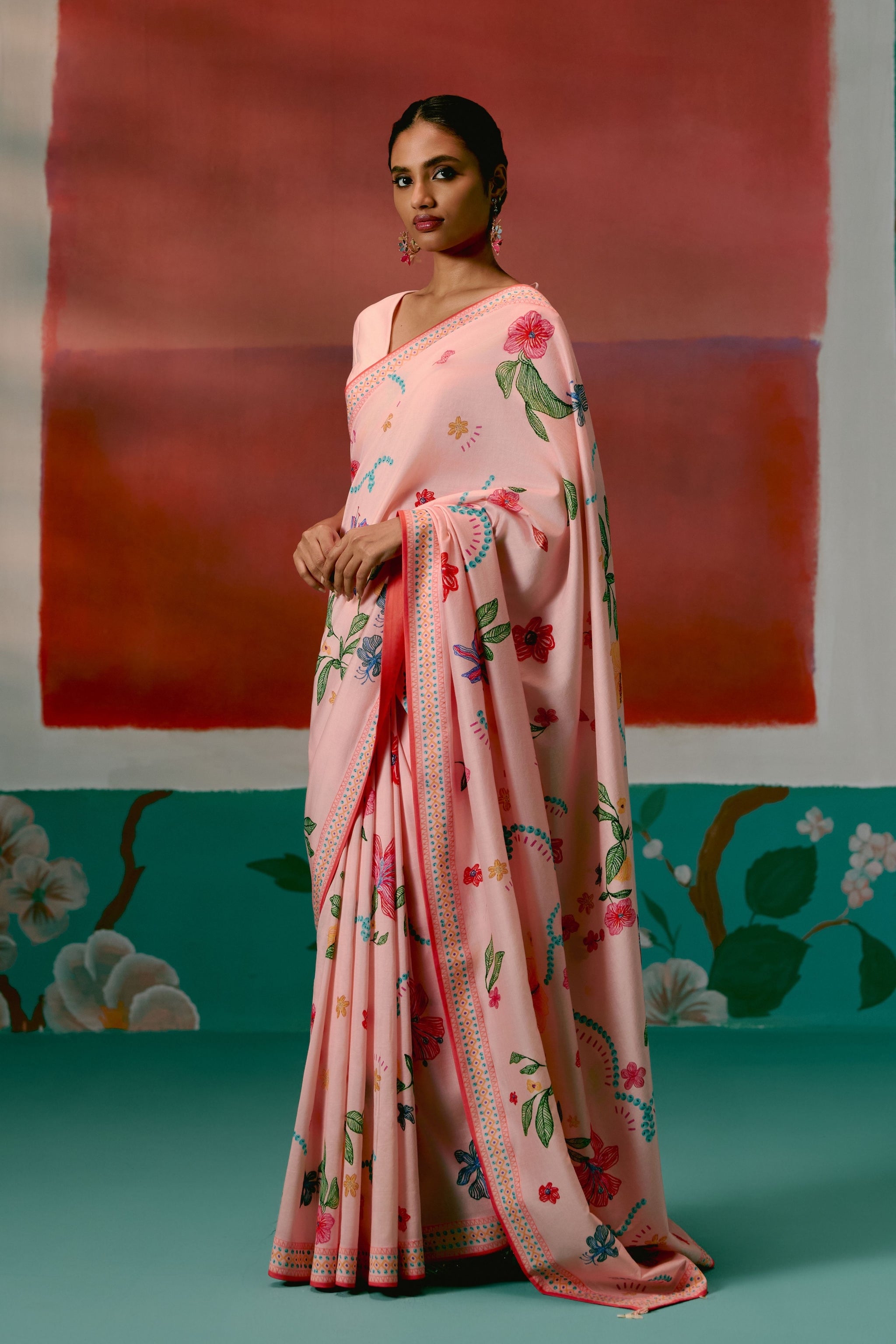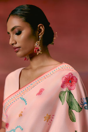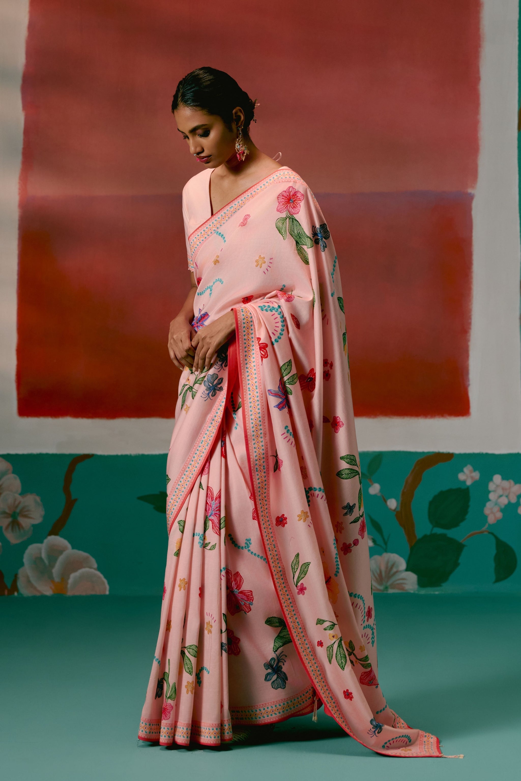 • Soft and romantic, this saree is designed on a dusty pink base with painterly floral motifs that exude feminine charm. The pallu is accented with handcrafted beaded tassels, adding just the right hint of sparkle to this elegant piece.