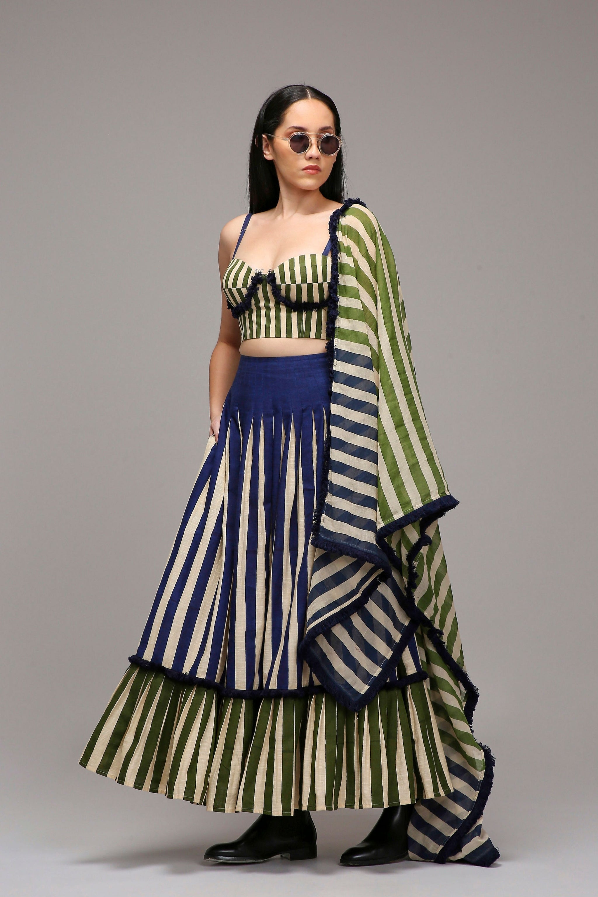 • This dual-striped skirt is crafted from handwoven cotton with hand-blocked stripe patterns, blending artisanal charm with a modern edge. It features a contrasting pleated side panel, pleated waistband, two side pockets, and a concealed zipper for comfort and ease. A fringed lace trim on the lower half adds texture. The set includes a matching corset with fringe detailing, a back opening, and adjustable straps. It also comes with a dual-striped stole, finished with tassel detailing at the edges for an added touch of elegance.