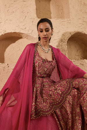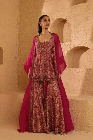 • A printed peplum set featuring a fully embroidered peplum with scalloped detailing at the hem, paired with a kaftan-style cape and a sharara. The cape carries delicate embroidery, adding a touch of fluid elegance to this intricately crafted ensemble.