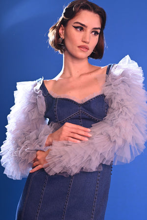 • Elegance meets intrigue in the elara denim dress. Intricate seam details embellished with beads create a masterpiece of texture, while voluminous lavender ruffled sleeves exude a touch of enchanting drama. A symphony of artistry and style, this dress is a celebration of exquisite craftsmanship.
