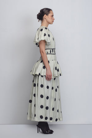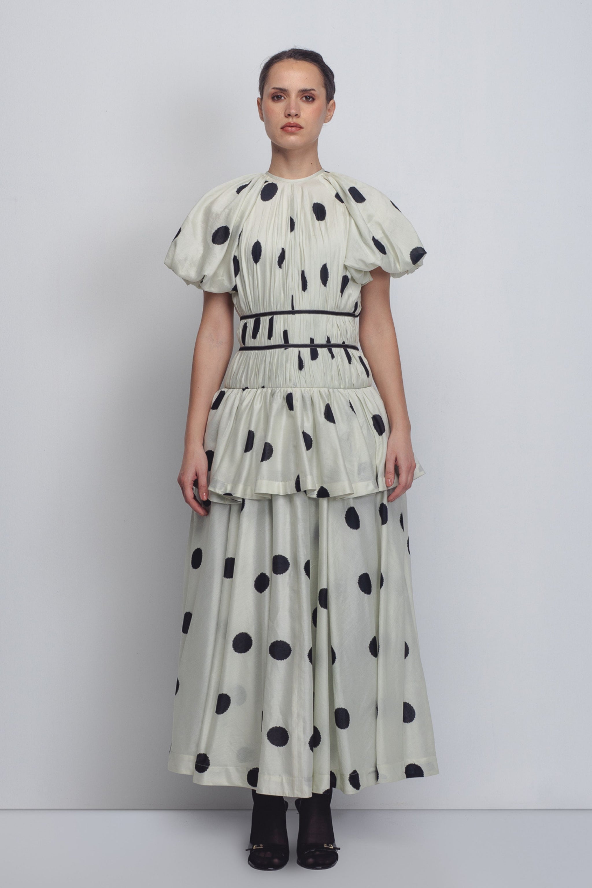 • Constructed in Chanderi printed in Polka-Dot, the design is characterized by a gathered neckline and voluminous puffed sleeves that create a dramatic silhouette, the garment explores fabric-manipulation technique, with gathers strategically secured by seam lines across the torso and highlighted with applied fabric strips that both secures and create an accent across the garment leading into a peplum and a full, floor-length skirt. The model is 5ft 8inches and the garment length is 55 inches.