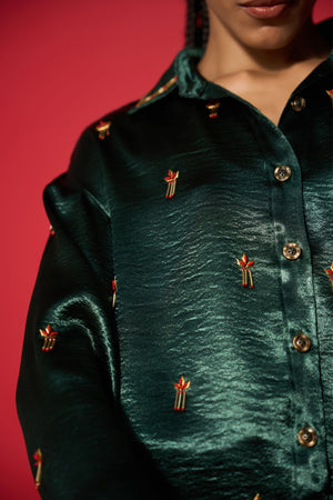 • This exquisite green satin co-ord set combines effortless elegance with artisanal charm. this stunning green satin button-down shirt is beautifully enhanced with delicate embroidered motifs scattered thoughtfully across the fabric. Perfect for both formal occasions and chic casual outings