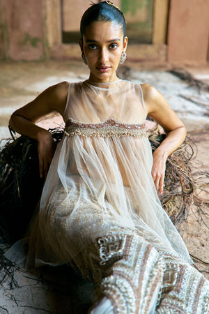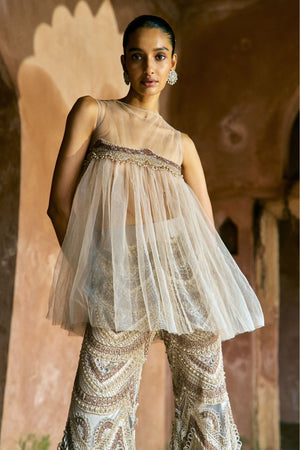 • A contemporary ensemble featuring intricately embroidered pants paired with a modern sheer top, lightly adorned with delicate embroidery to complement the richness of the pants. This outfit harmoniously balances detailed craftsmanship with minimalist modernity, creating a look that is elegant, sophisticated, and effortlessly stylish.