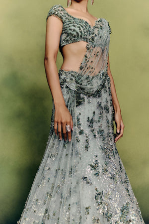 • Exuding serene sophistication, this mint-green cocktail lehenga is meticulously hand embroidered to create a play of texture and light. A delicately detailed tulle neckline adds a whisper of romance, balancing modern elegance with timeless artistry.