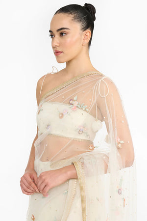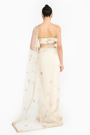 • Embroidered saree paired with tie up spaghetti strap blouse.