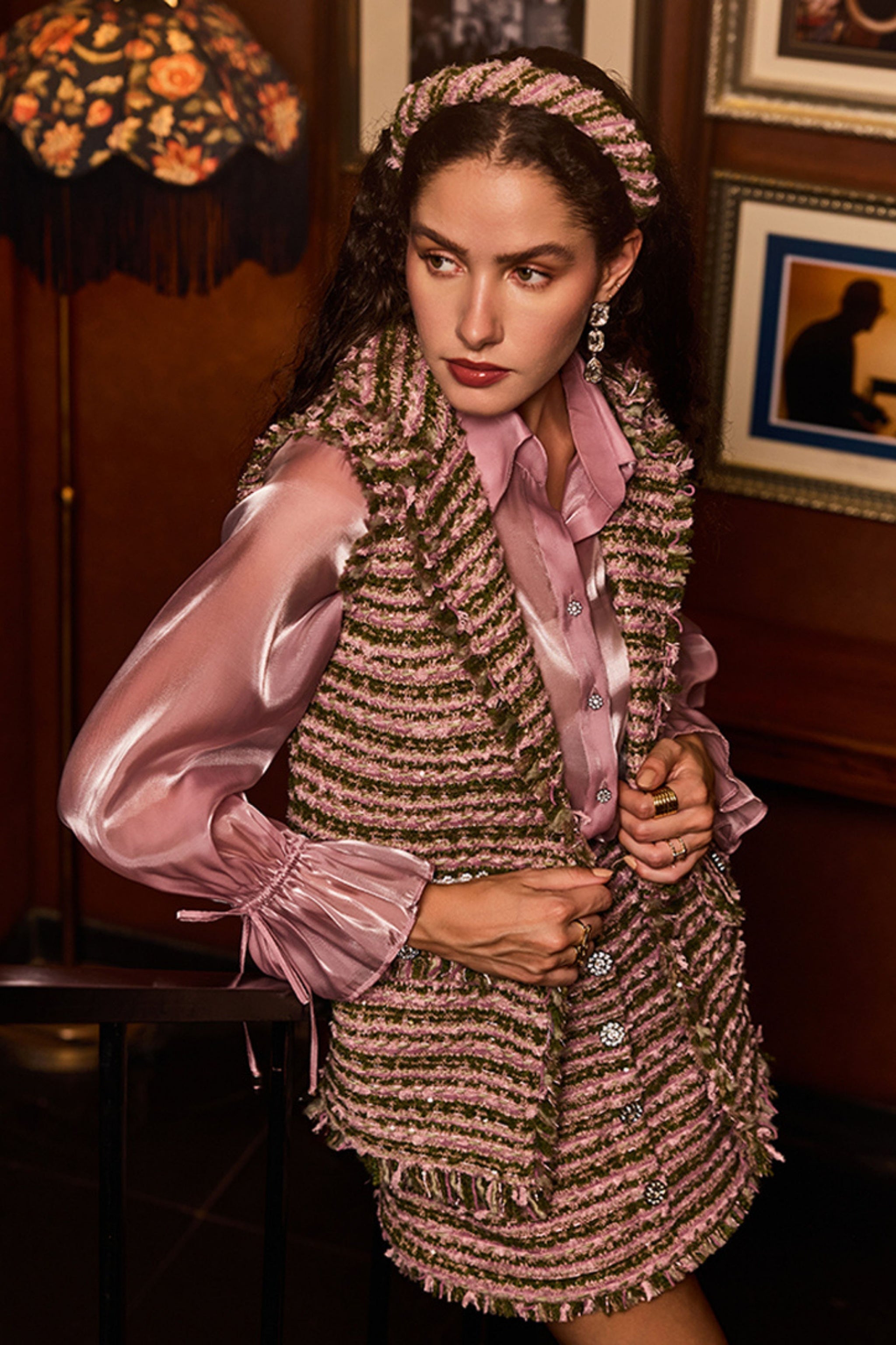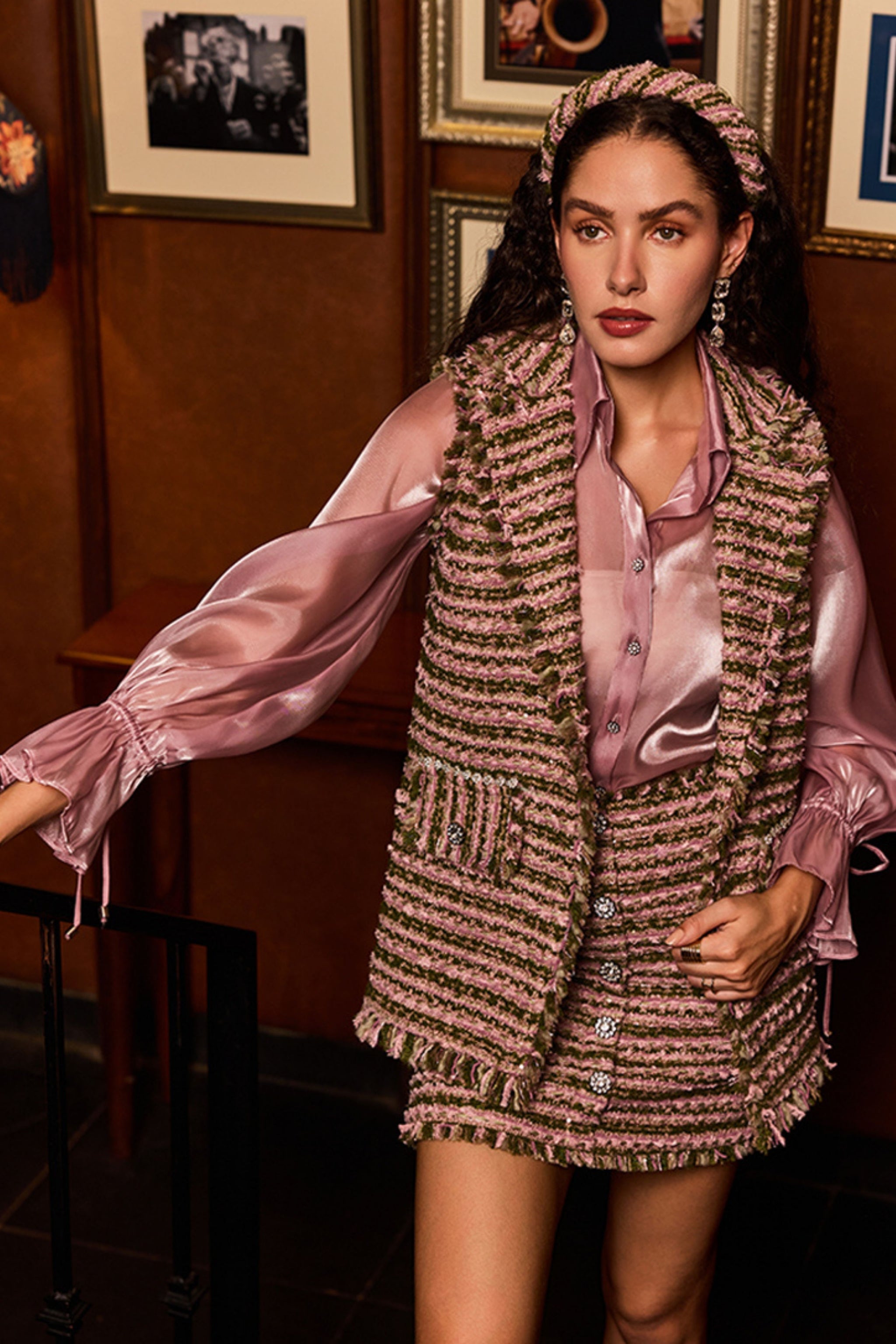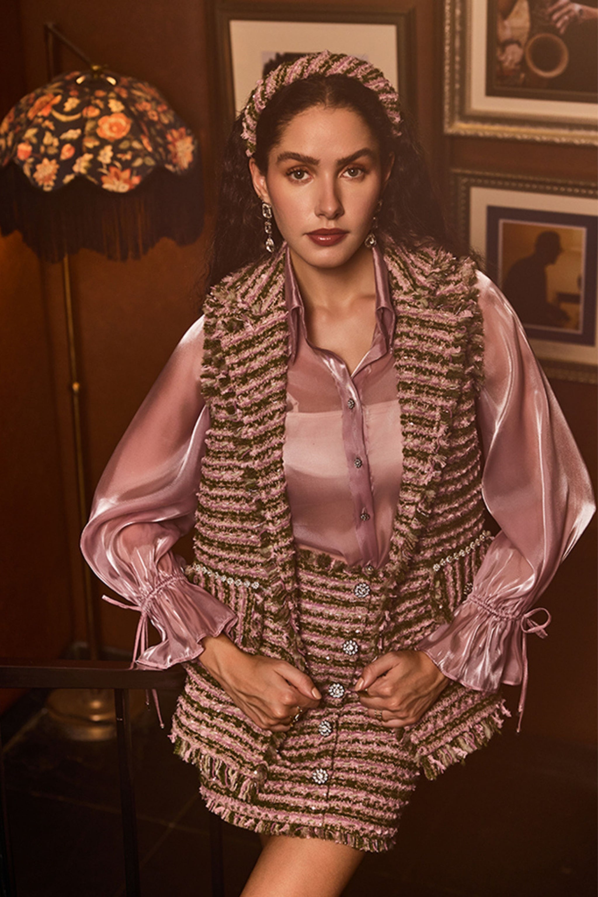 • This ensemble features a relaxed-fit sleeveless tweed gilet with a front opening, frayed edges, a lapel collar, crystal-detailed pocket flaps, and crystal buttons, paired with an A-line tweed skirt with an elasticated back waistband, side zipper closure, crystal buttons, and fringe detailing, and completed with a relaxed-fit organza shirt featuring a button-down front, shirt collar, and frill cuffs with ties. Model's Height: 5'8'