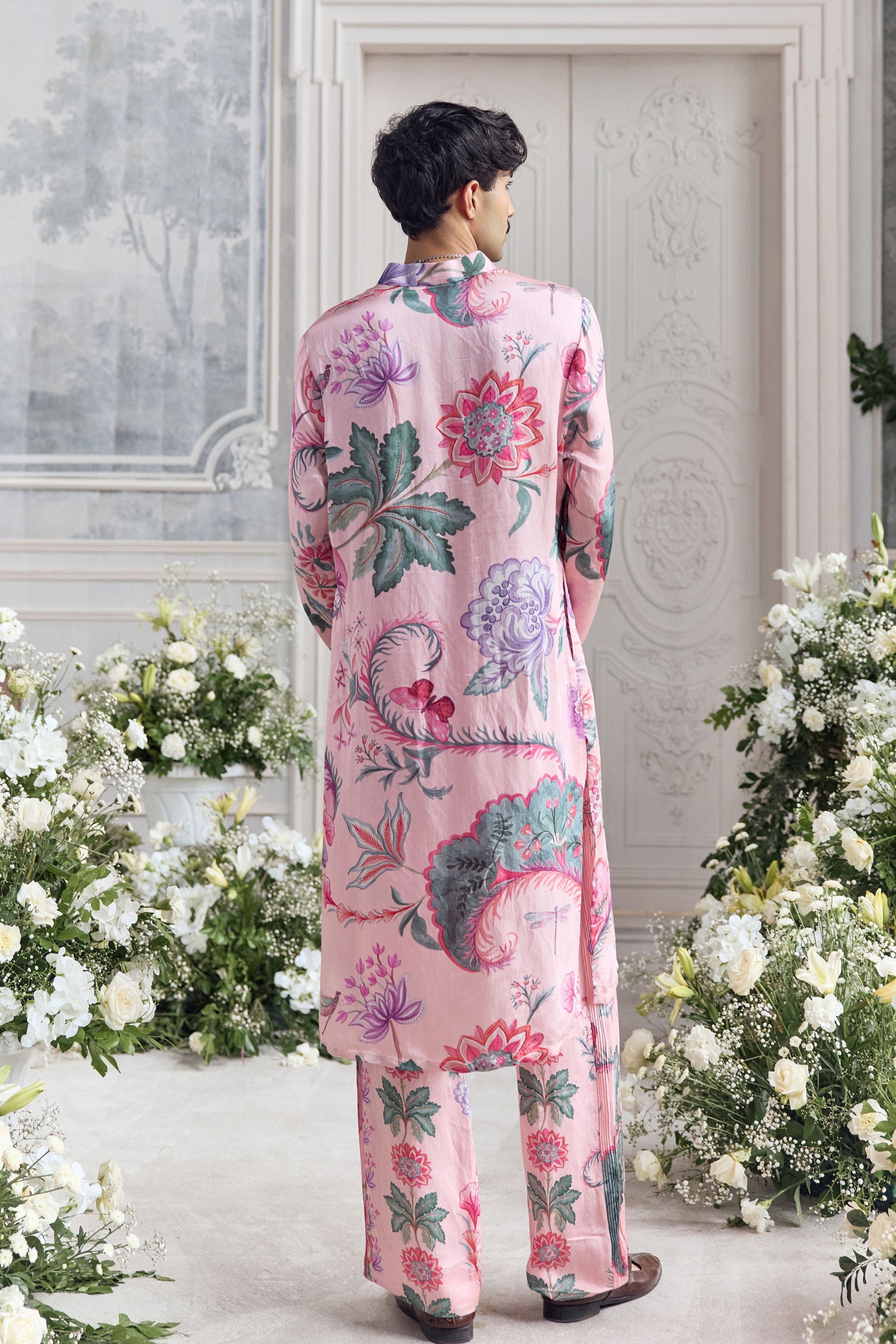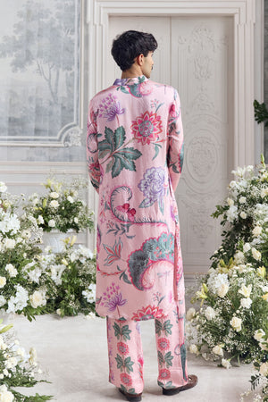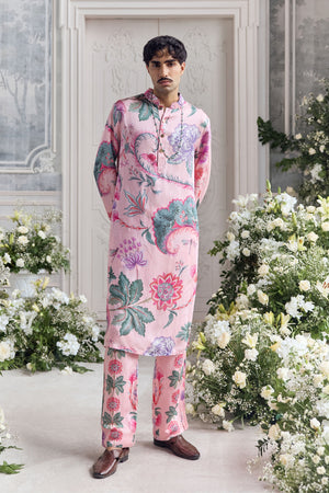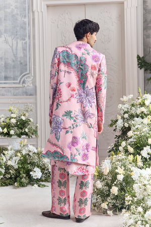 • Hand embroidered sherwani paired with kurta and pintuck detailing trouser
