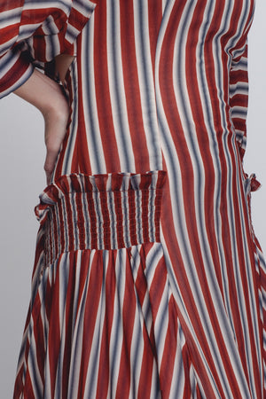 • A classic midi dress with a sensual undertone, crafted in striped georgette that lends the garment a light, fluid movement and effortless drape. The silhouette is refined yet striking, featuring a half-front concealed zipper opening and a structured collar that balances softness with precision. At the back, an open detail reveals a subtle glimpse of skin, adding quiet allure to the otherwise timeless form. The model is 5'10", and the garment length is 55 inches.