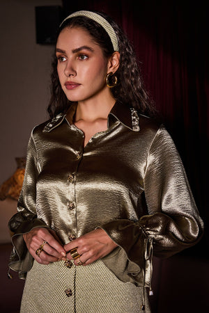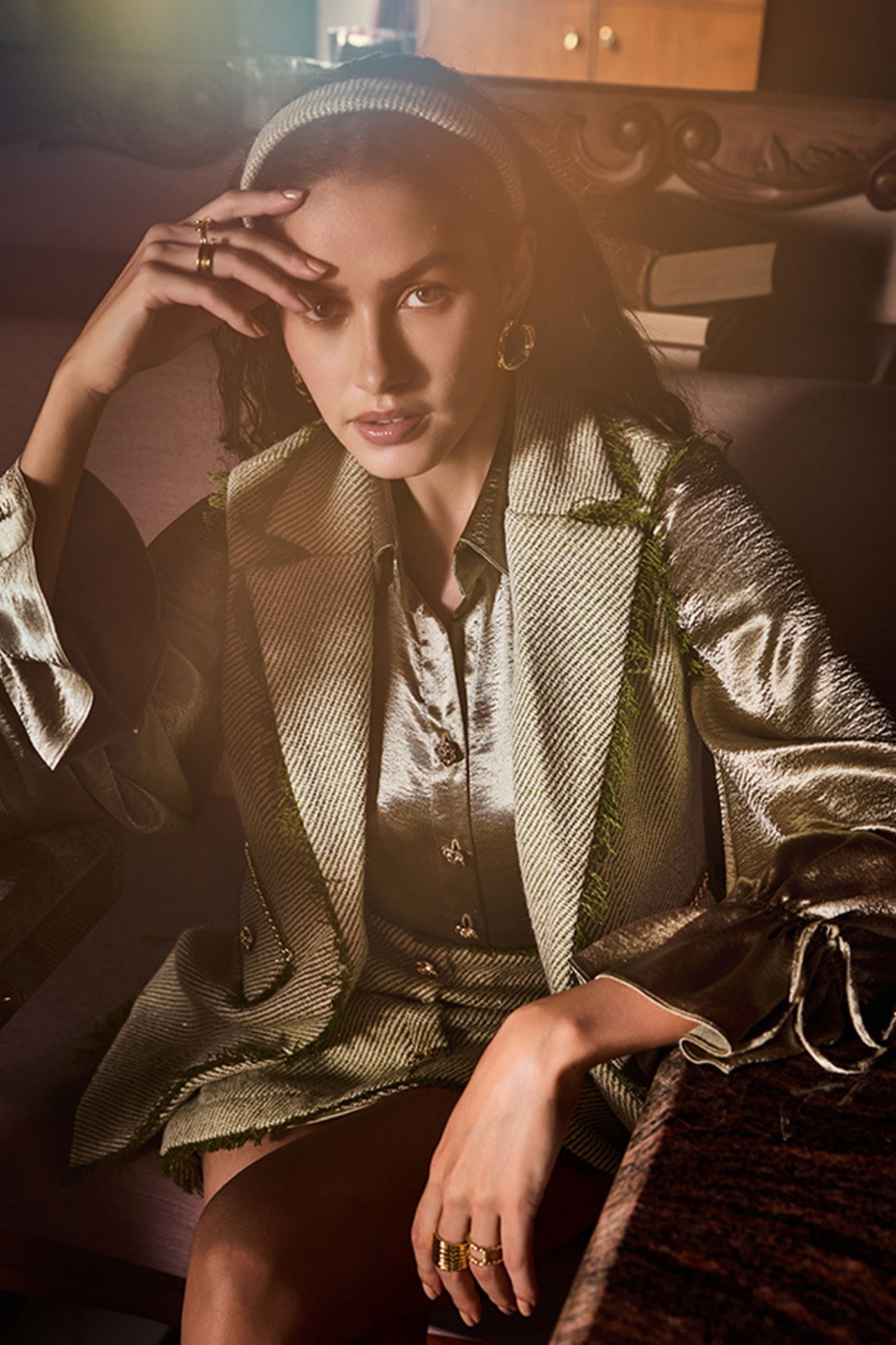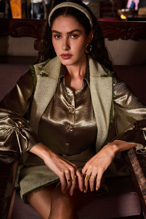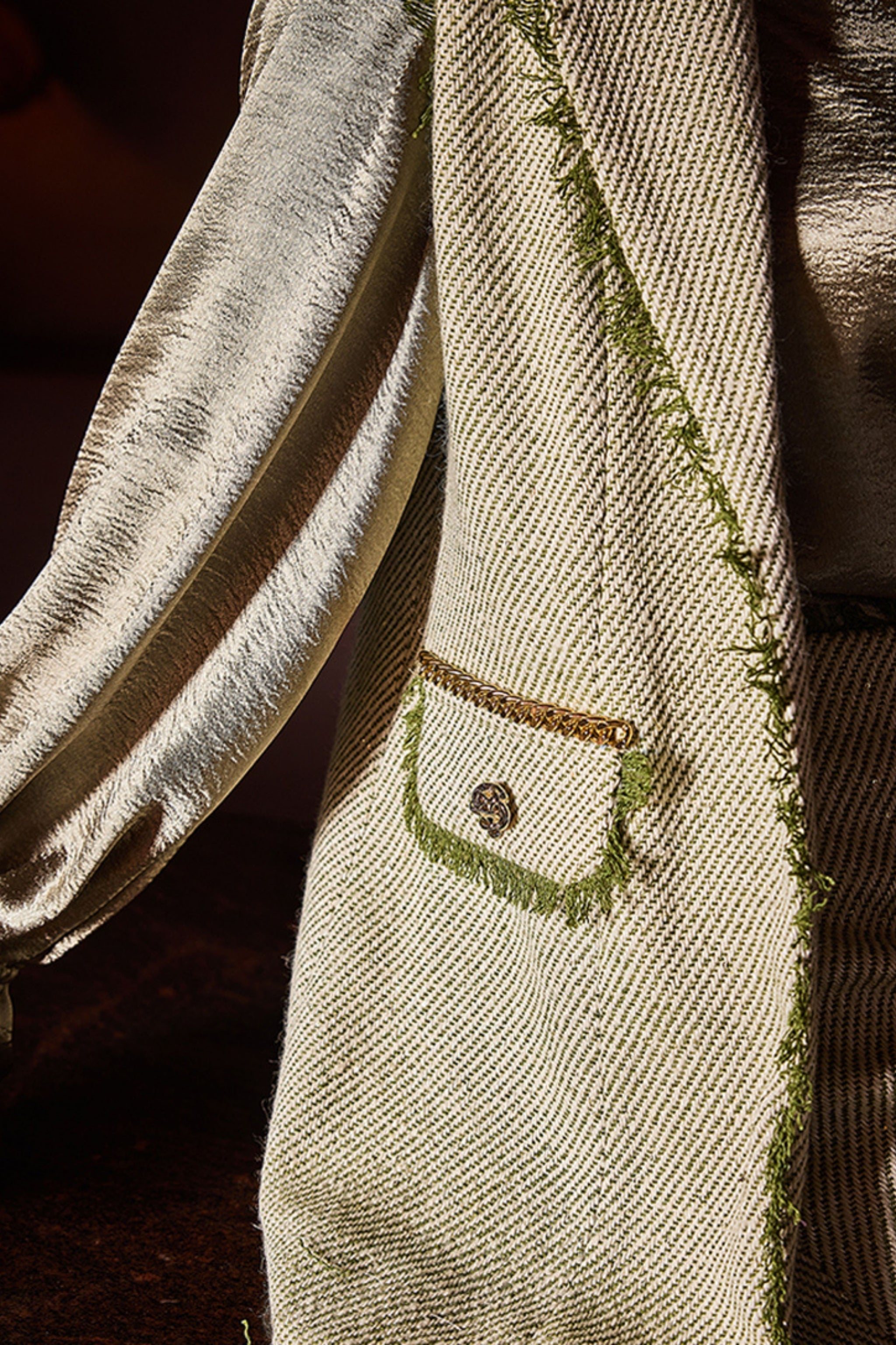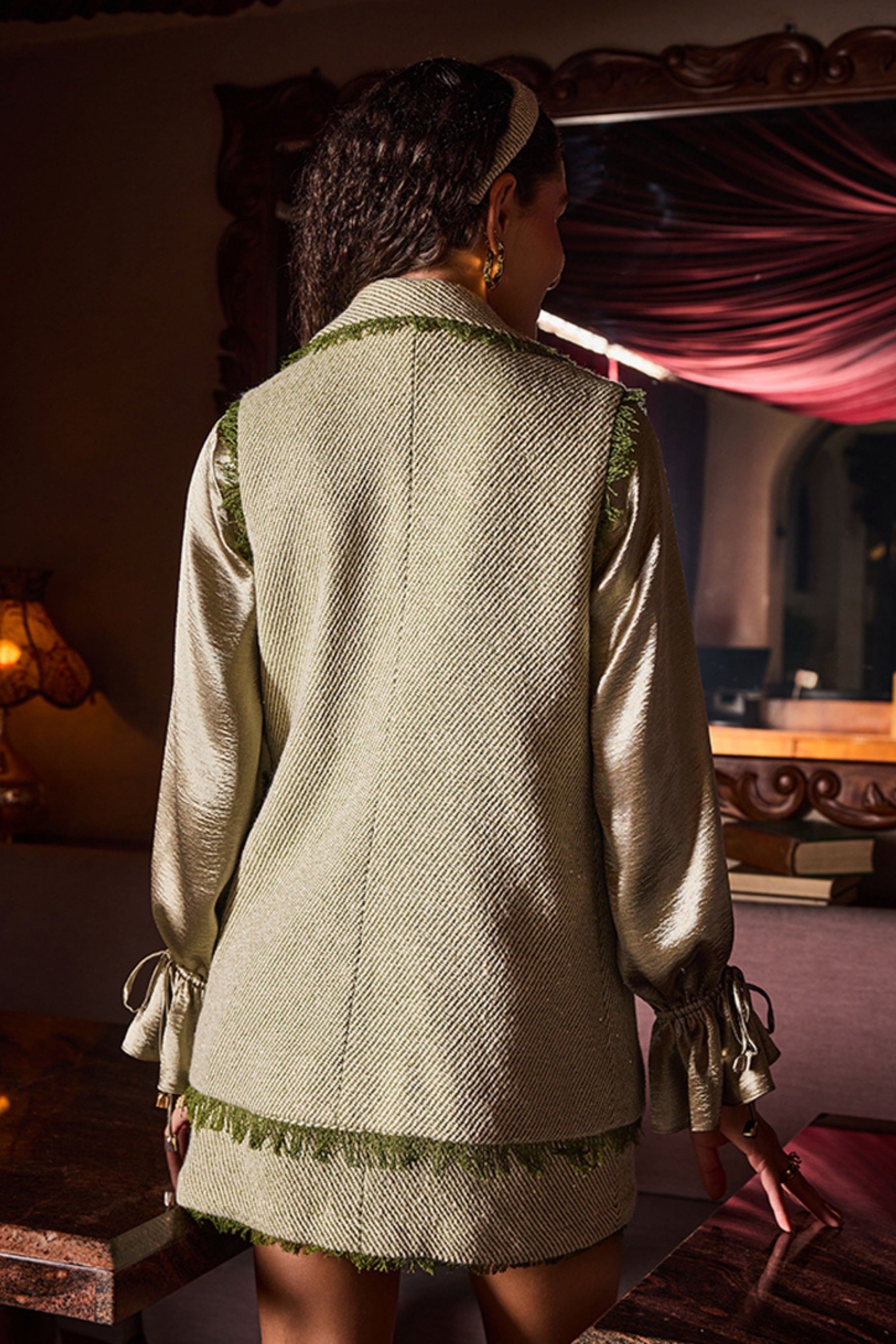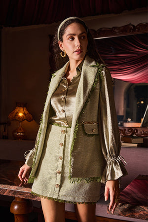 • This ensemble features a relaxed-fit sleeveless tweed gilet with a front opening, frayed edges, a lapel collar, metallic chain–detailed pocket flaps, and gold metallic buttons, paired with an A-line tweed skirt with an elasticated back, side zipper closure, gold metallic buttons, and fringe detailing, and completed with a relaxed-fit high-gloss satin shirt with a button-down front with gold metallic buttons, shirt collar, and frill cuffs with ties. Model's Height: 5'8'