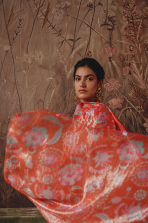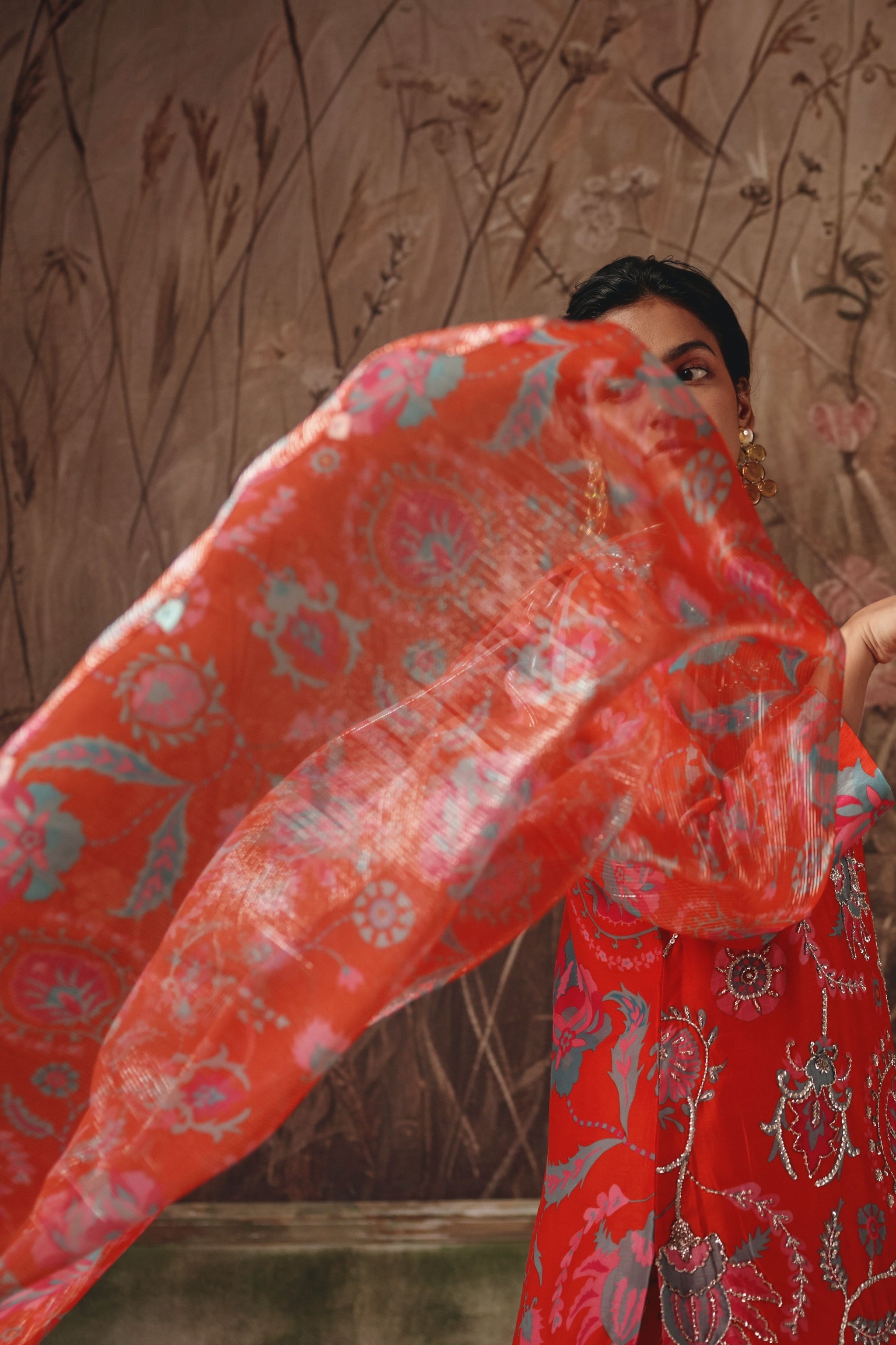 • Bold, bright, and steeped in bakhtar heat — this set blends flame-red tones with cool blue and rose motifs. The kurta’s simplicity lets the colours take centre stage, while the sweeping sharara adds graceful volume. A statement piece crafted for celebrations that call for colour without heaviness.