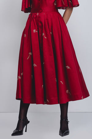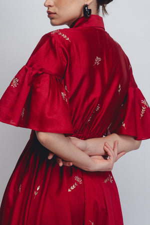 • Crafted in Chanderi, this garment showcases artisanal craftsmanship through thoughtful textile surface development, embellished with hand-embroidered floral motifs with Zari threads and sequins. The design features delicate pintucks at the front, adding texture, structure, and a refined handcrafted character. The model is 5 feet 8 inches and the garment length is 50 inches.