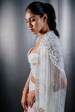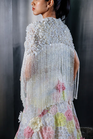 • This multi colour floral skirt set features a bridal skirt with extensive floral embroidery and 3d flowers to elevate the look. It is paired with a pearl corset top in a tulle base and a fringe cape with stunning paillettes detailing.