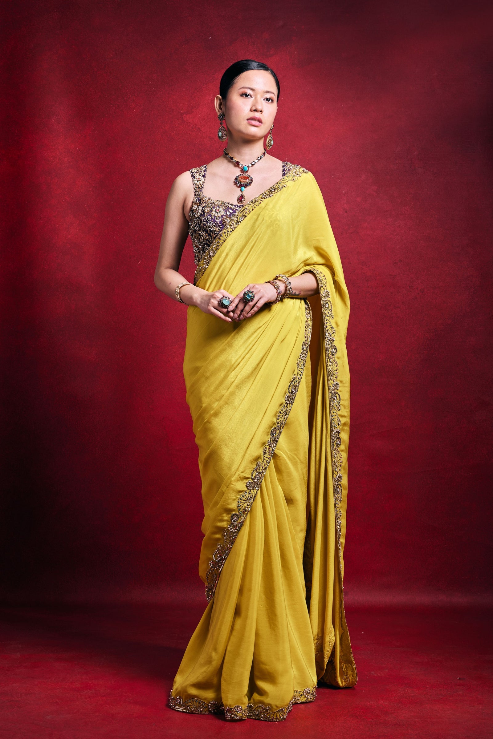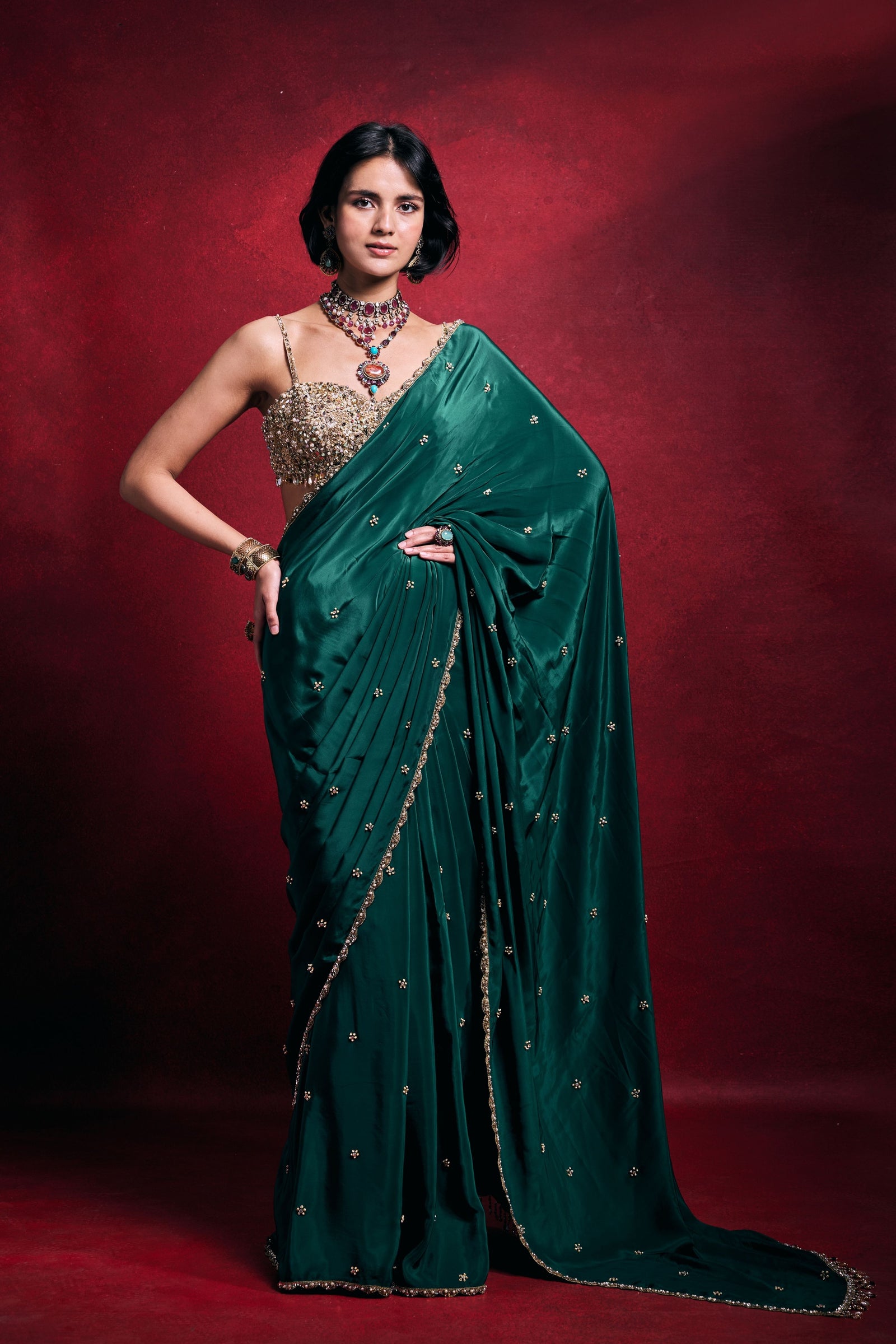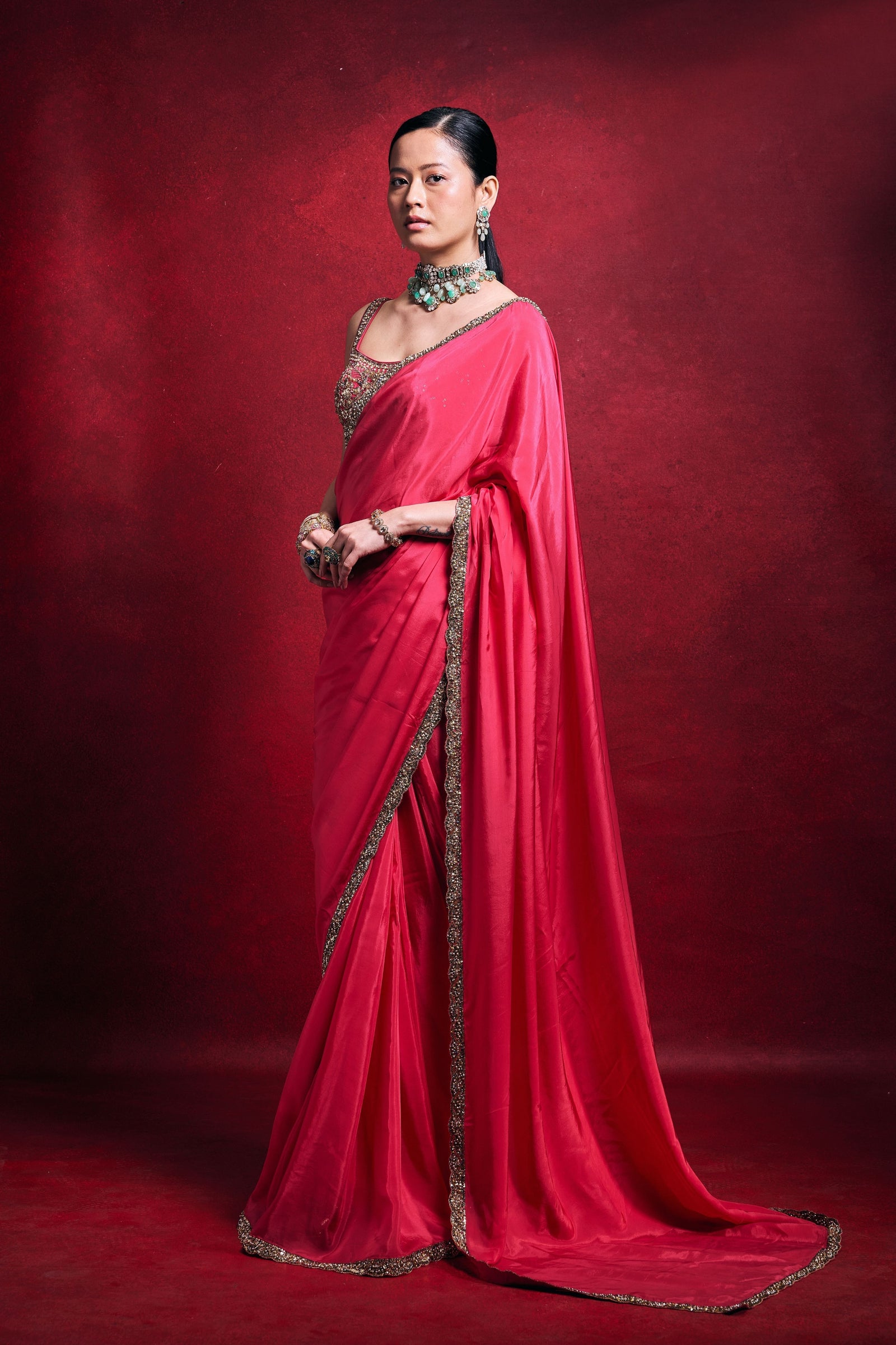 • Crafted in luxurious habutai silk with a sheer organza drape, this fuchsia pink ensemble radiates elegance. Intricately embellished with stone, mirror, pearl, sequin, dori, sadi, nakshi, and zari work, it blends rich texture with refined festive glamour.