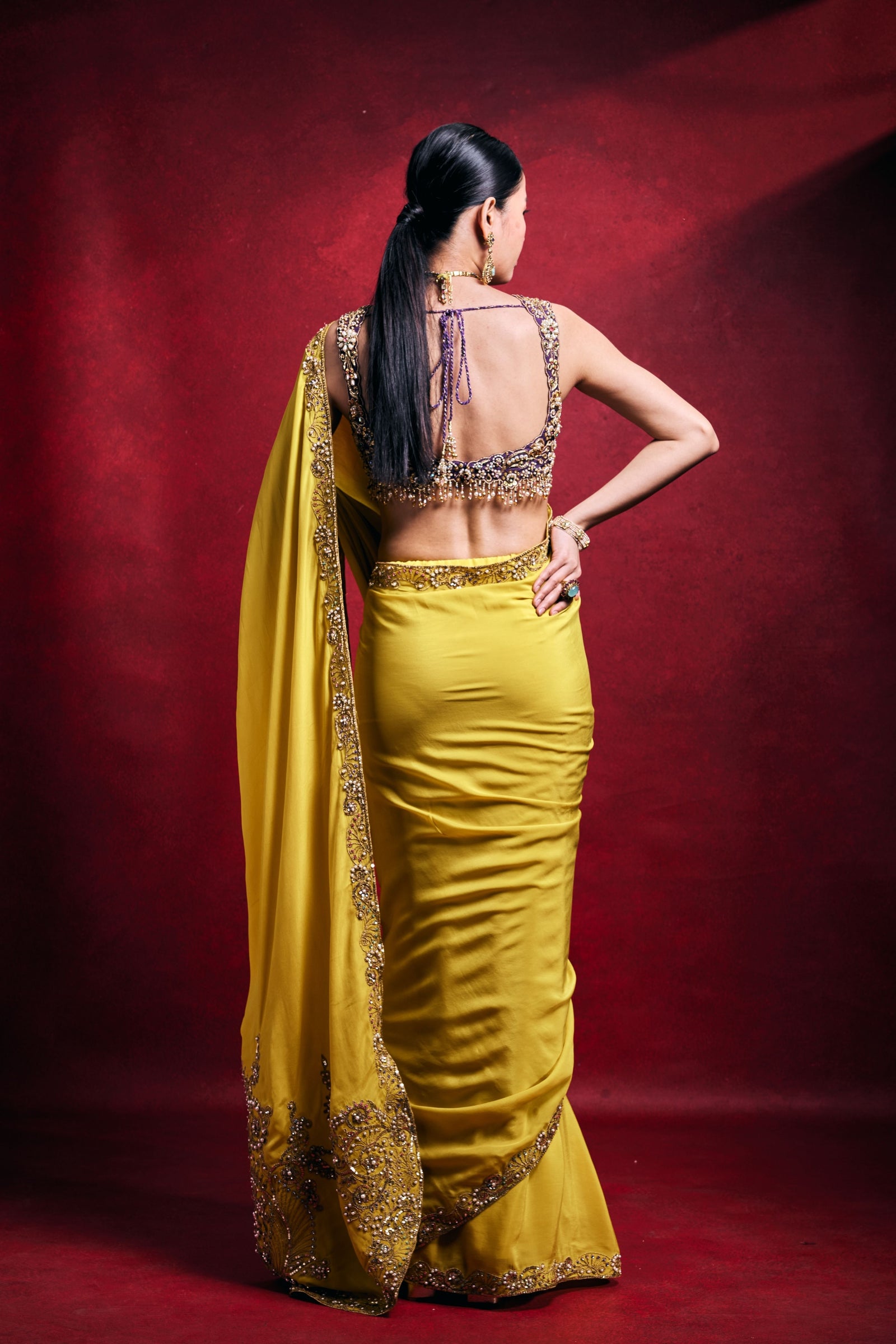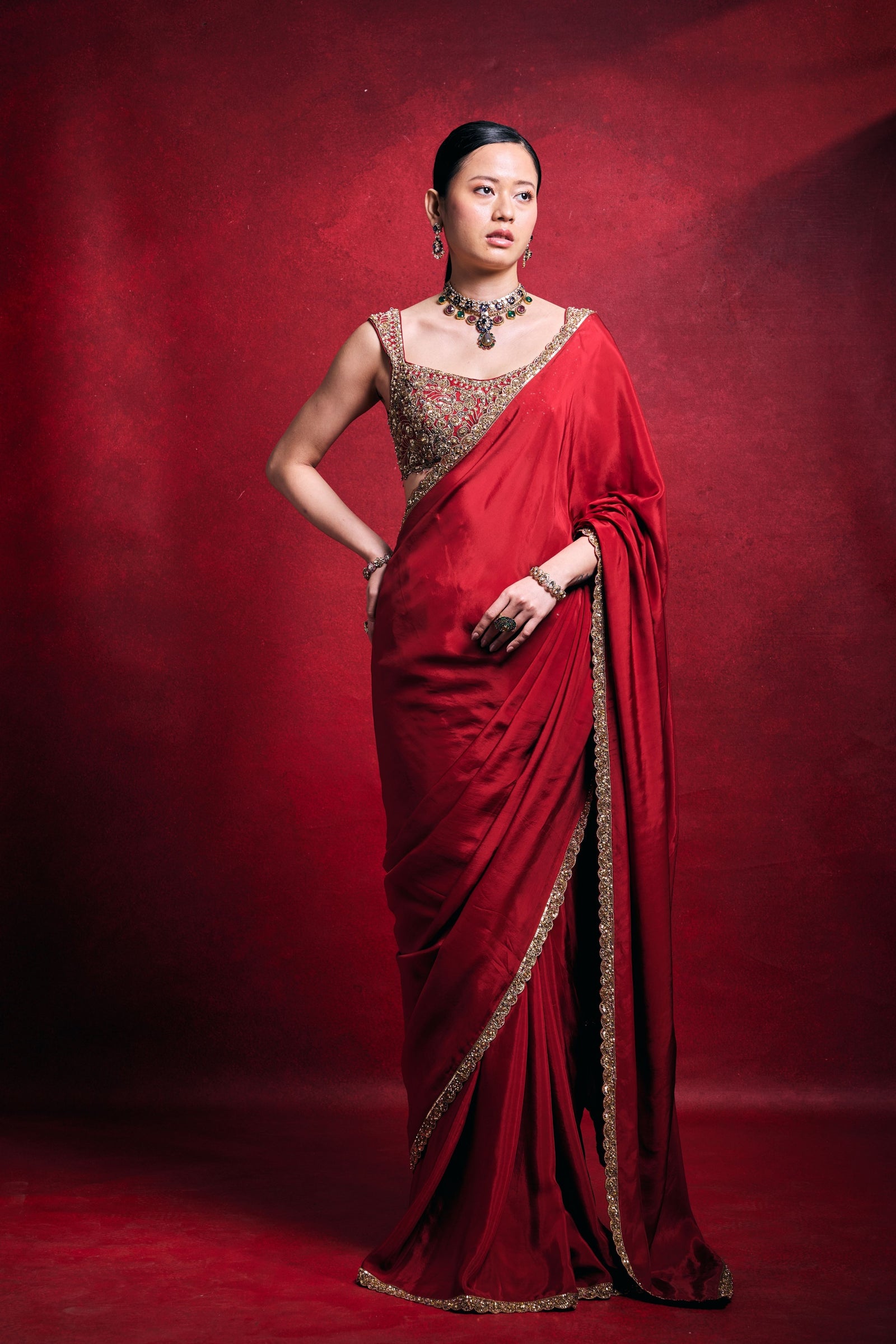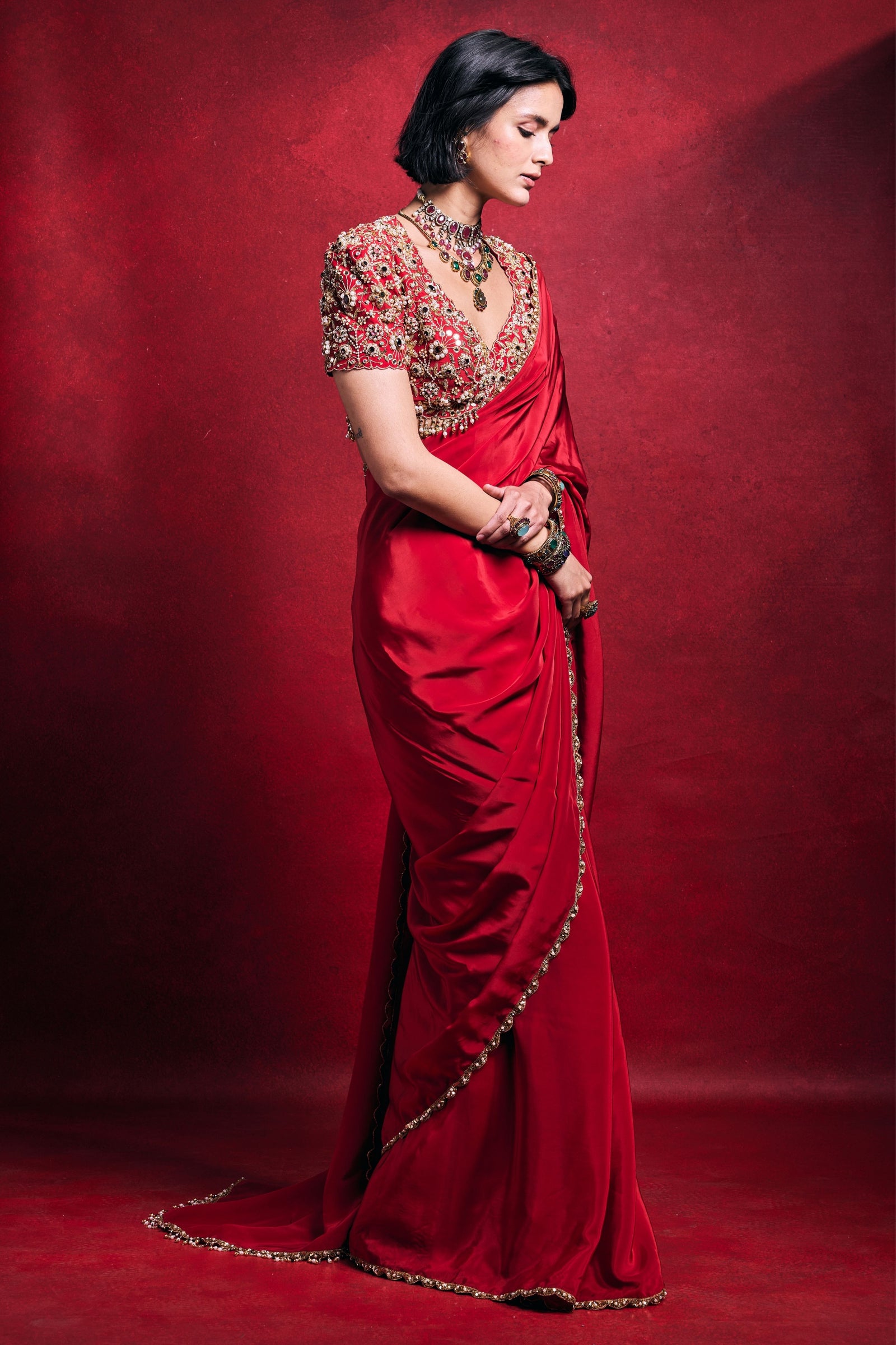 • Crafted in luxurious habutai silk with a sheer organza drape, this fuchsia pink ensemble radiates elegance. Intricately embellished with stone, mirror, pearl, sequin, dori, sadi, nakshi, and zari work, it blends rich texture with refined festive glamour.