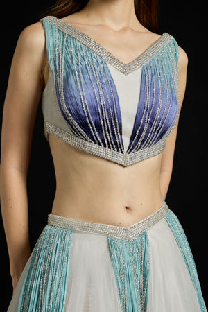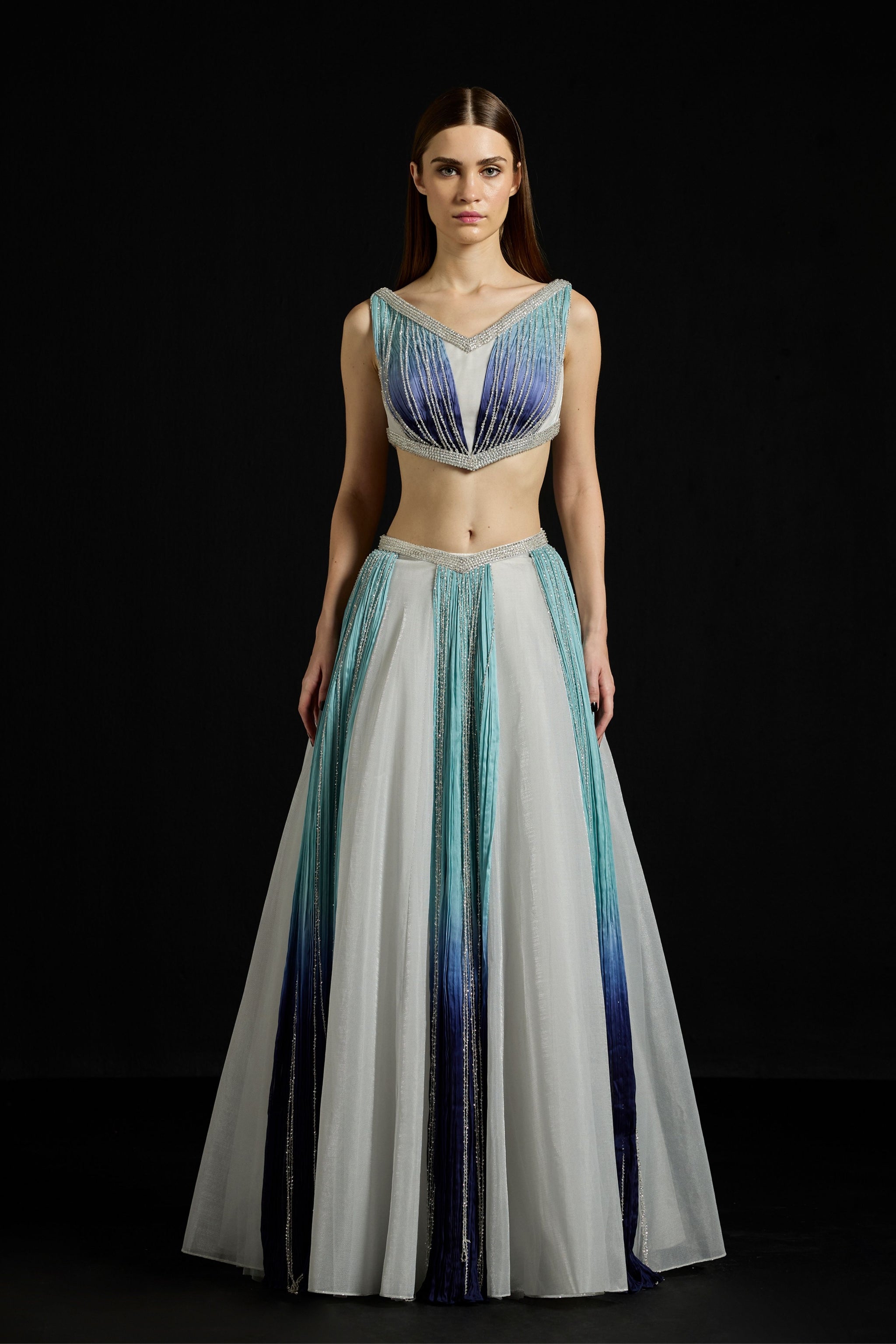 • Bustier crafted with hand-dyed gradient gathered Chiffon and hand-embroidered sequin fringes. Paired with a Metallic-Tulle skirt with gradient Chiffon fall-panels and hand-embroidered sequin fringes.