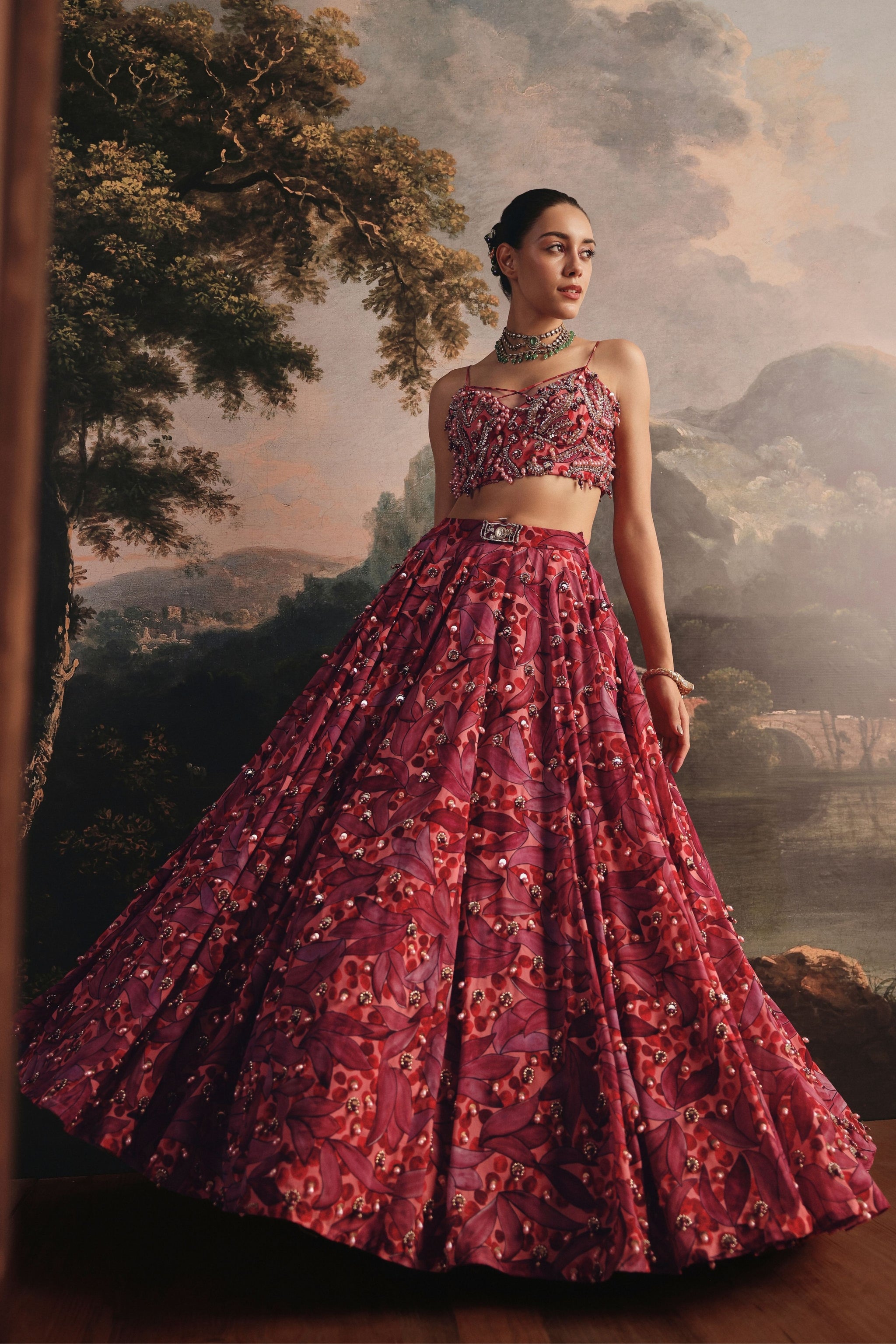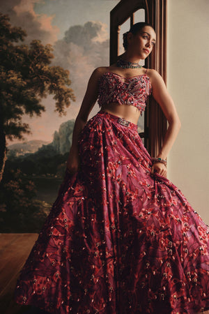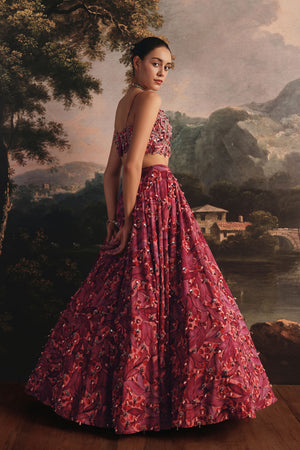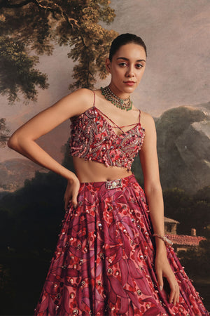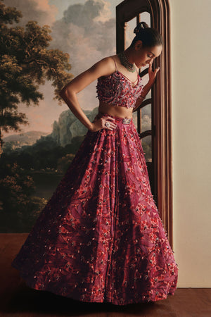 • A stunning lehenga in rich shades of red and pink, this ensemble beautifully blends modern vibrance with traditional artistry. The skirt features delicate embroidery spread across the surface, accentuated with soft pink and golden beads that add subtle sparkle and texture. Paired with a matching embroidered blouse and dupatta, perfect for weddings and grand celebrations.