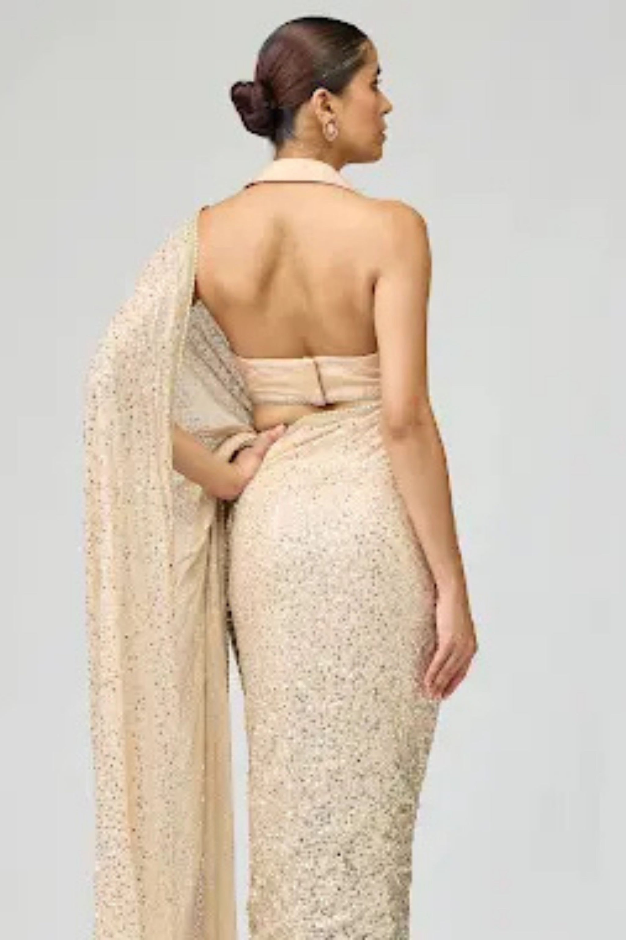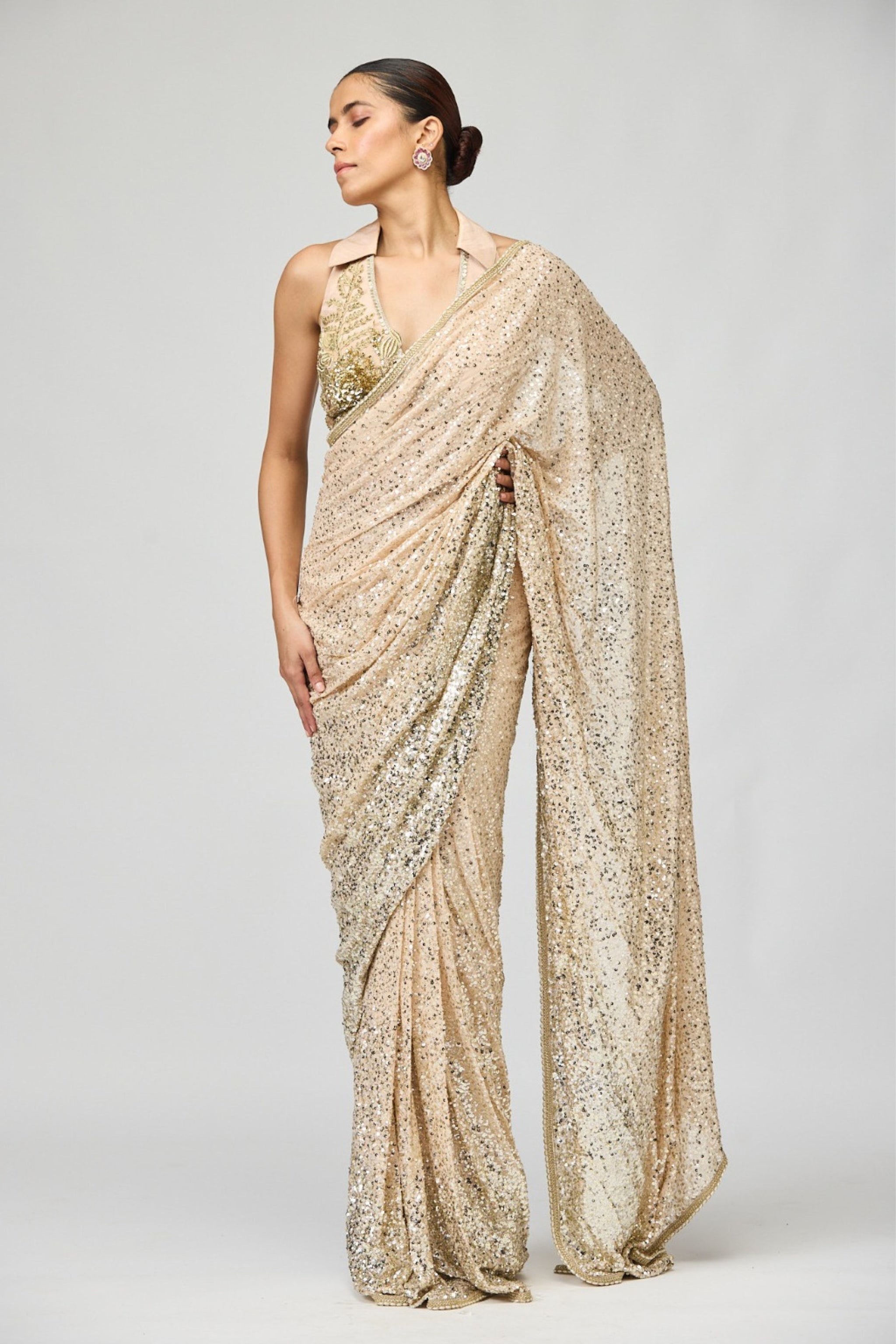 • This elegant beige saree set is crafted in lightweight ggt fabric and features a beautifully blended ombre effect enhanced with three types of sequin work. The subtle shimmer and fluid drape create a graceful silhouette, making it a perfect choice for evening celebrations and festive occasions.