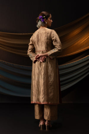 • Gold tissue front slit long kurta embroidered with 3d floral motifs with applique work decorated with zari, resham and sequence highlight. It is paired with striped chanderi pants.