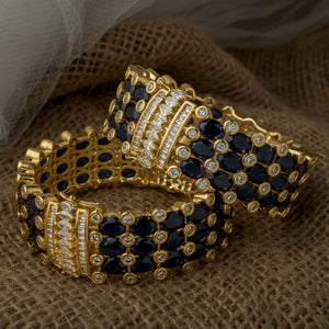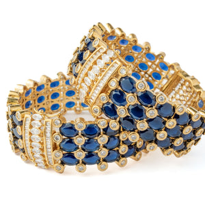 • Elegant gold bracelets adorned with blue sapphires and diamonds, showcasing exquisite craftsmanship. Hinge with screw closure. Anti-allergic and safe for skin, products do not tarnish