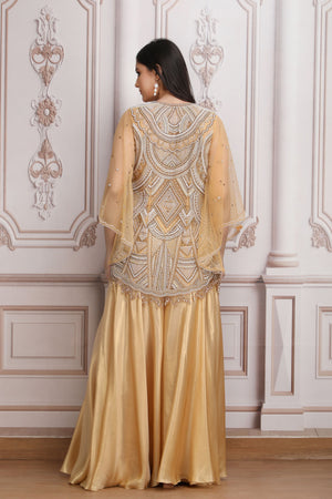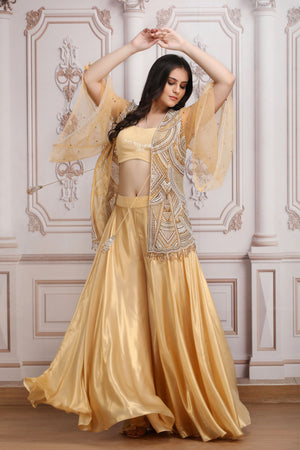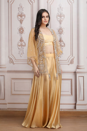 • A radiant golden co-ord set featuring a fluid pants, bustier, and an intricately pearl embroidered sheer jacket, exuding effortless glamour and contemporary grace.